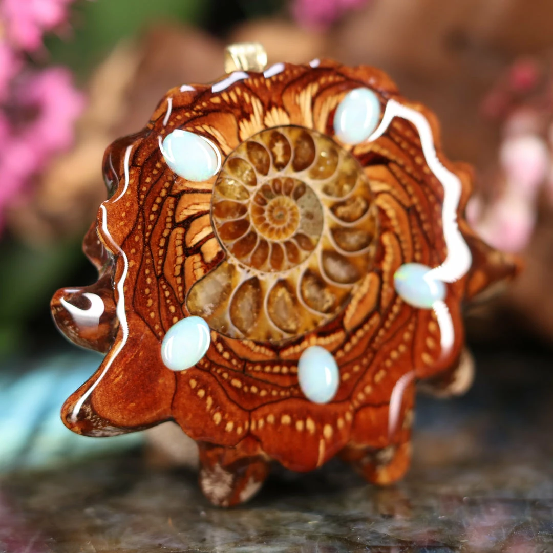 The 240 million year old ammonite fossils form a sacred geometrical shape called the “golden mean spiral,” traveling both infinitely outward and infinitely inward. This spiral can be mathematically represented by the Fibonacci Sequence – the numerical foundation that depicts the underlying growth, movement, and evolution throughout all of nature. Plants unfurl, flowers bloom, and our galaxy spirals according to this sequence. The ammonites are fitted expertly into the center of each pine cone’s mandala so as to blend the golden mean spirals of tree and shell into a single dynamic Fibonacci movement – evoking a sense of wonder and connectedness to our universe’s greater intelligent design.