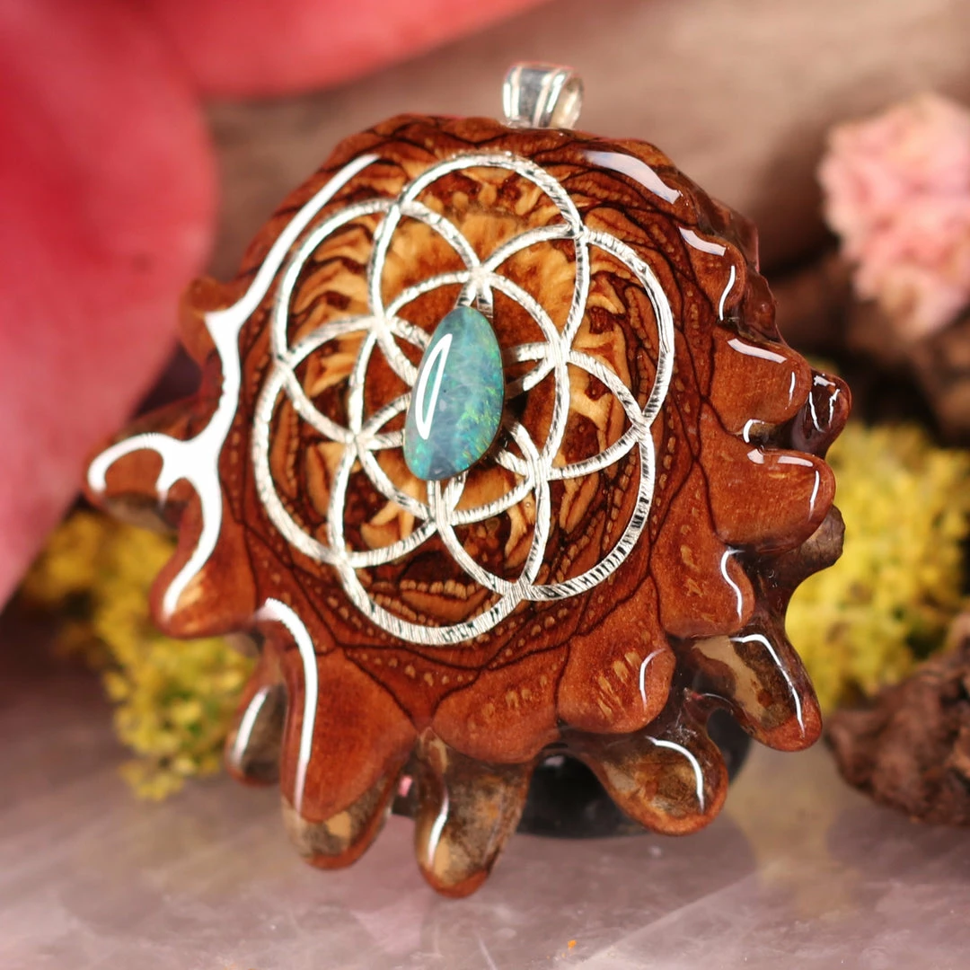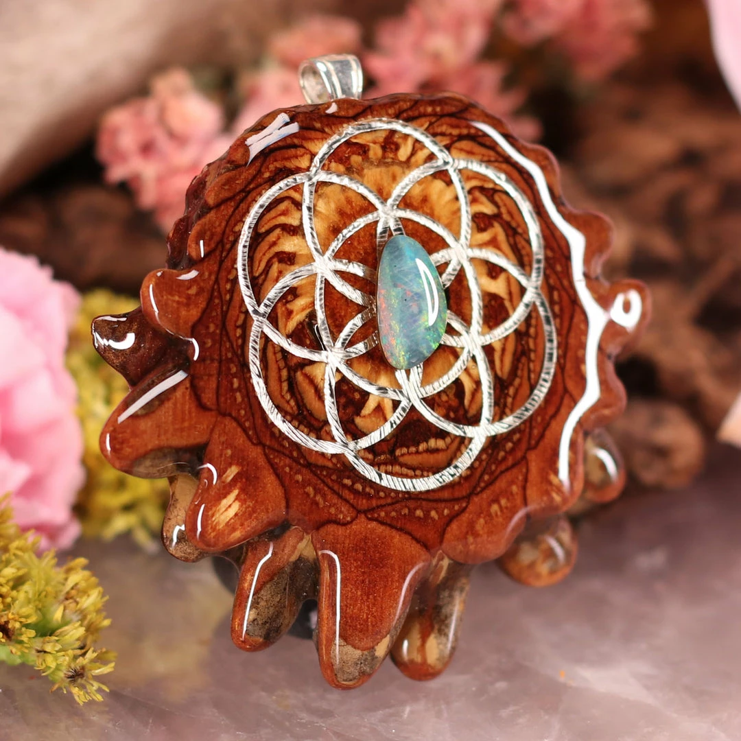 Every pinecone pendant is an elegant gift from Mother Nature — unveiling the ornate Sacred Geometry hidden at the center of one of the world’s densest Pinecones. Because only one cross-section is taken from the “heart” of each Cone, every pendant is absolutely unique, and truly one-of-a-kind.