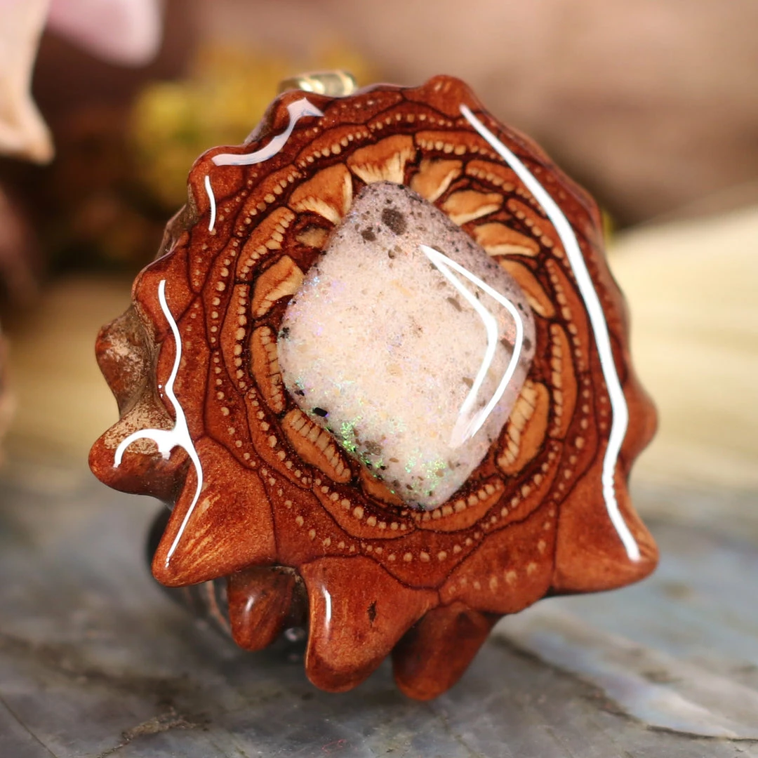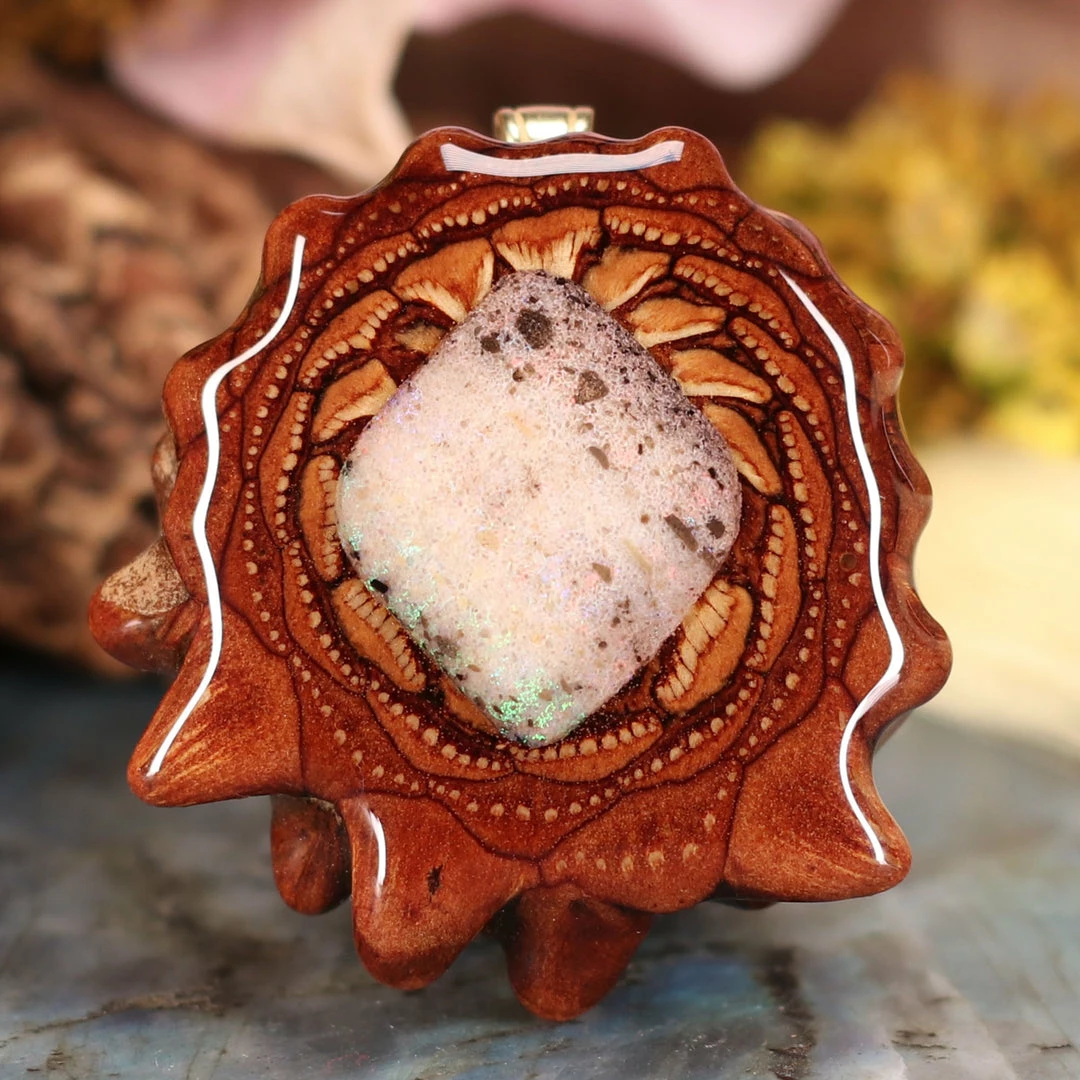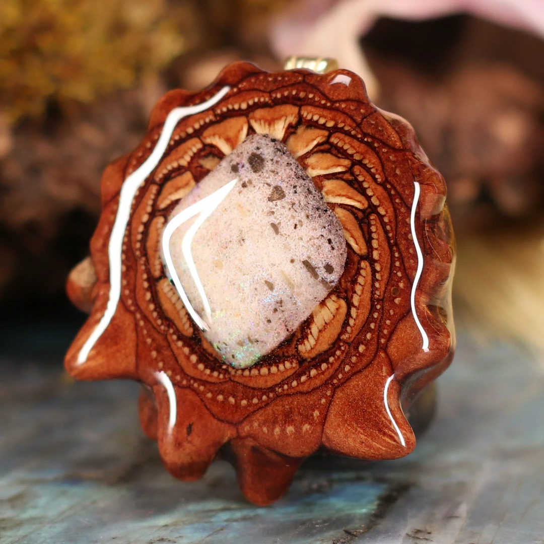 Every pinecone pendant is an elegant gift from Mother Nature — unveiling the ornate Sacred Geometry hidden at the center of one of the world’s densest Pinecones. Because only one cross-section is taken from the “heart” of each Cone, every pendant is absolutely unique, and truly one-of-a-kind.