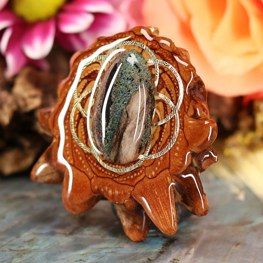 Every pinecone pendant is an elegant gift from Mother Nature — unveiling the ornate Sacred Geometry hidden at the center of one of the world’s densest Pinecones. Because only one cross-section is taken from the “heart” of each Cone, every pendant is absolutely unique, and truly one-of-a-kind.
