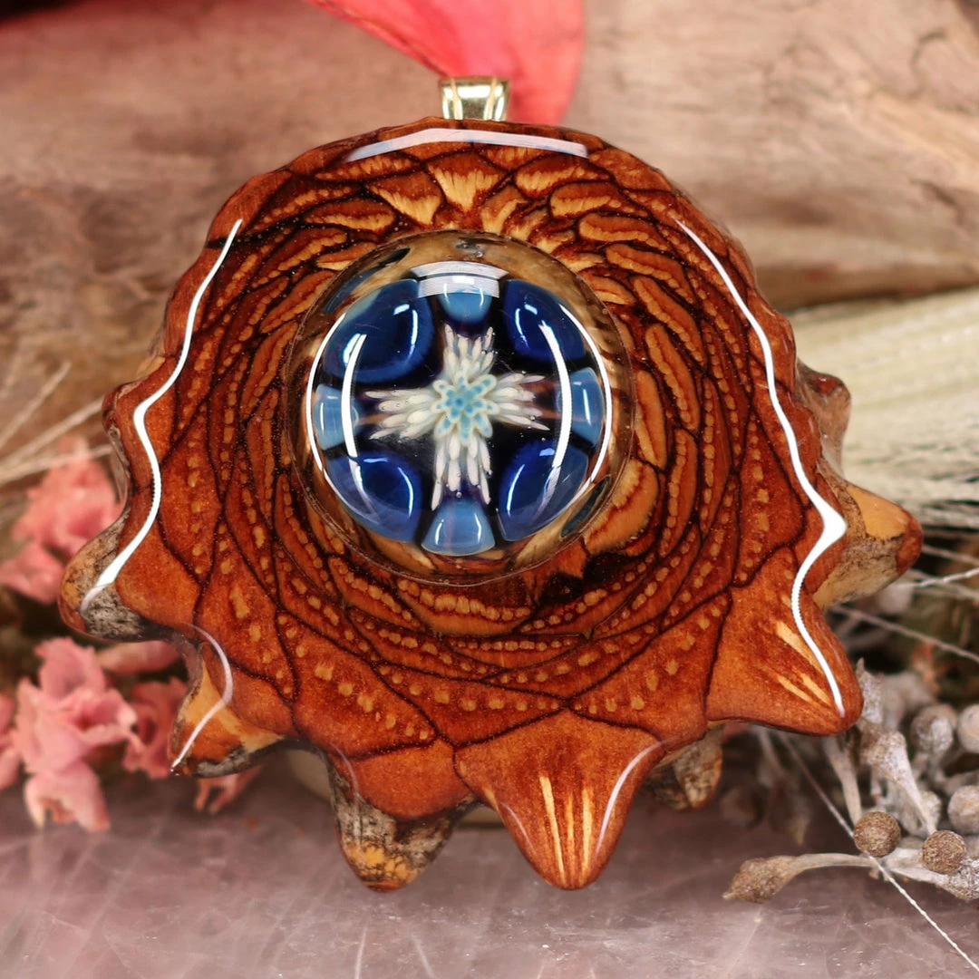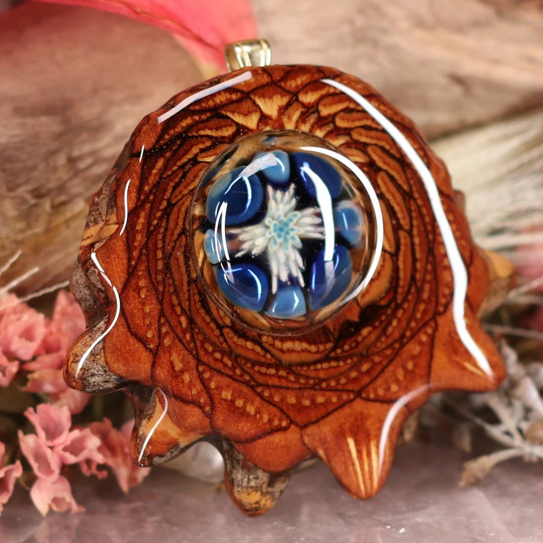 This epic collaboration between Third Eye Pinecones and Nick Anderson Art features a small Glass “Phoenix Orchid” Cab set inside one of our Pinecone Pendants!