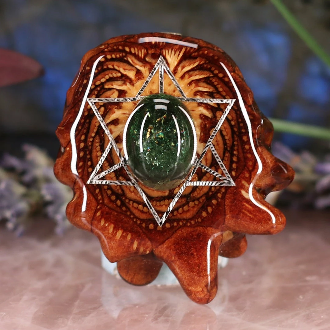 This Pinecone has been anointed with our “Merkaba” emblem, cast in Sterling Silver. Merkaba – “Mer” meaning Light, “Ka” meaning Spirit, and “Ba” meaning Body – is a powerful icon historically known as the “Vehicle of Ascension”. The Merkaba opens the mind to increased awareness and promotes deep conscious interconnection.