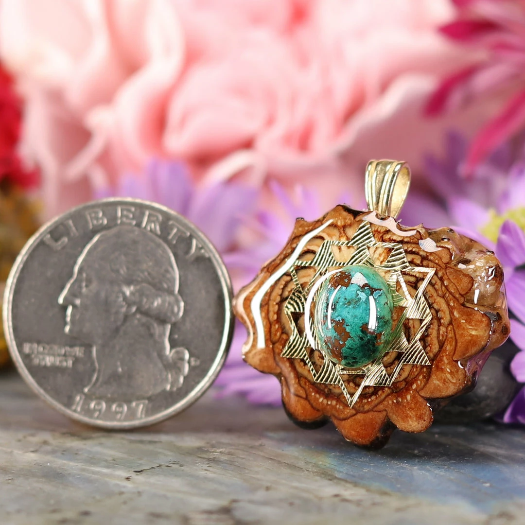 Every pinecone pendant is an elegant gift from Mother Nature — unveiling the ornate Sacred Geometry hidden at the center of one of the world’s densest Pinecones. Because only one cross-section is taken from the “heart” of each Cone, every pendant is absolutely unique, and truly one-of-a-kind.