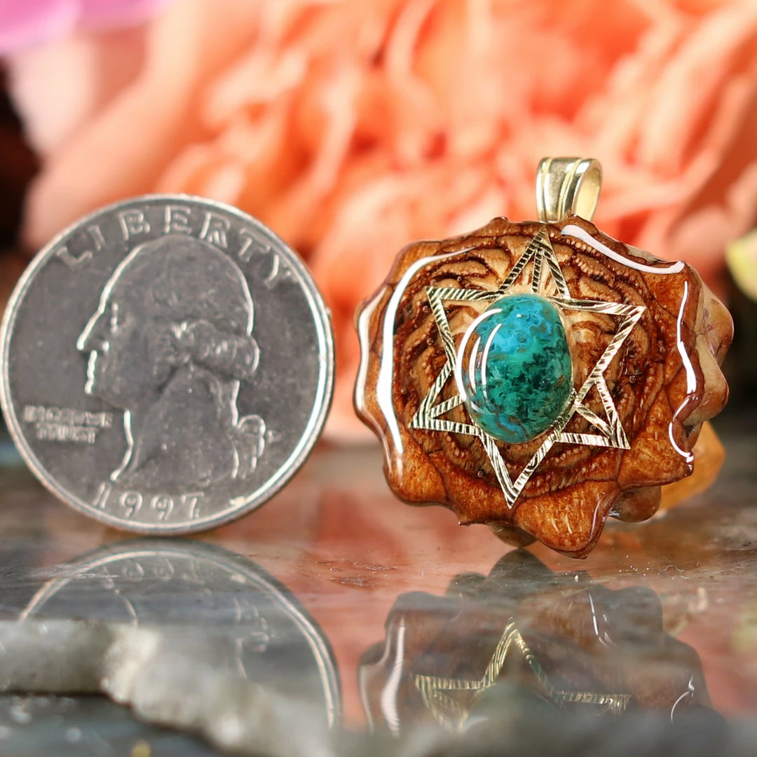 Every pinecone pendant is an elegant gift from Mother Nature — unveiling the ornate Sacred Geometry hidden at the center of one of the world’s densest Pinecones. Because only one cross-section is taken from the “heart” of each Cone, every pendant is absolutely unique, and truly one-of-a-kind.