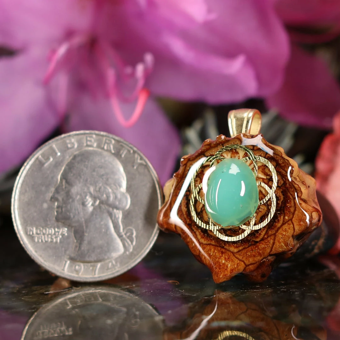 Every pinecone pendant is an elegant gift from Mother Nature — unveiling the ornate Sacred Geometry hidden at the center of one of the world’s densest Pinecones. Because only one cross-section is taken from the “heart” of each Cone, every pendant is absolutely unique, and truly one-of-a-kind.
