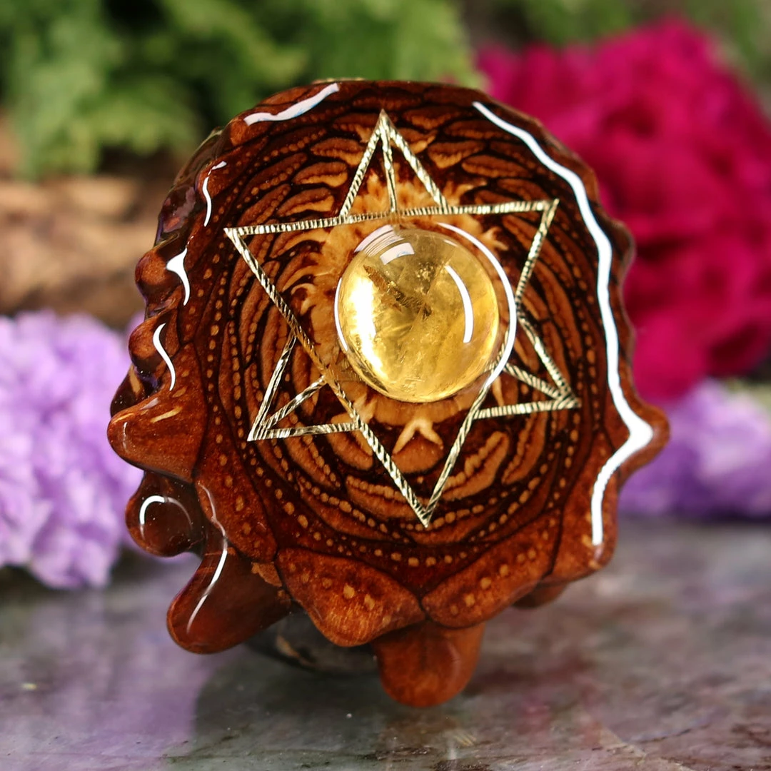 This Pinecone has been anointed with our “Merkaba” emblem, cast in 24k Gold. Merkaba – “Mer” meaning Light, “Ka” meaning Spirit, and “Ba” meaning Body – is a powerful  icon historically known as the “Vehicle of Ascension”. The Merkaba opens the mind to increased awareness and promotes deep conscious interconnection.