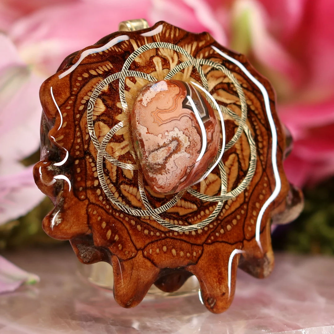 Every pinecone pendant is an elegant gift from Mother Nature — unveiling the ornate Sacred Geometry hidden at the center of one of the world’s densest Pinecones. Because only one cross-section is taken from the “heart” of each Cone, every pendant is absolutely unique, and truly one-of-a-kind.