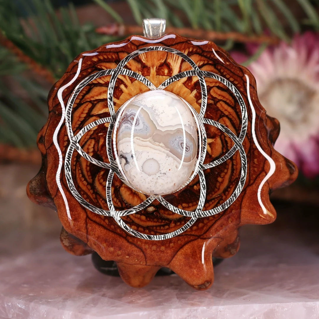 Every pinecone pendant is an elegant gift from Mother Nature — unveiling the ornate Sacred Geometry hidden at the center of one of the world’s densest Pinecones. Because only one cross-section is taken from the “heart” of each Cone, every pendant is absolutely unique, and truly one-of-a-kind.