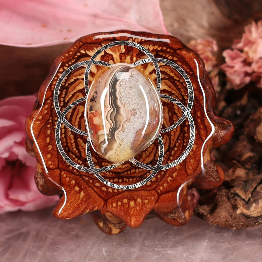 This Pinecone has been blessed with the Seed of Life, cast in Sterling Silver. This sacred symbol serves as the foundation or “Seed” for the Flower of Life, and represents the Seven days of Creation. It depicts the origins of all matter, in geometric perfection, with six circles (the six days of work) resting inside a seventh circle (the day of rest, the sabbath).