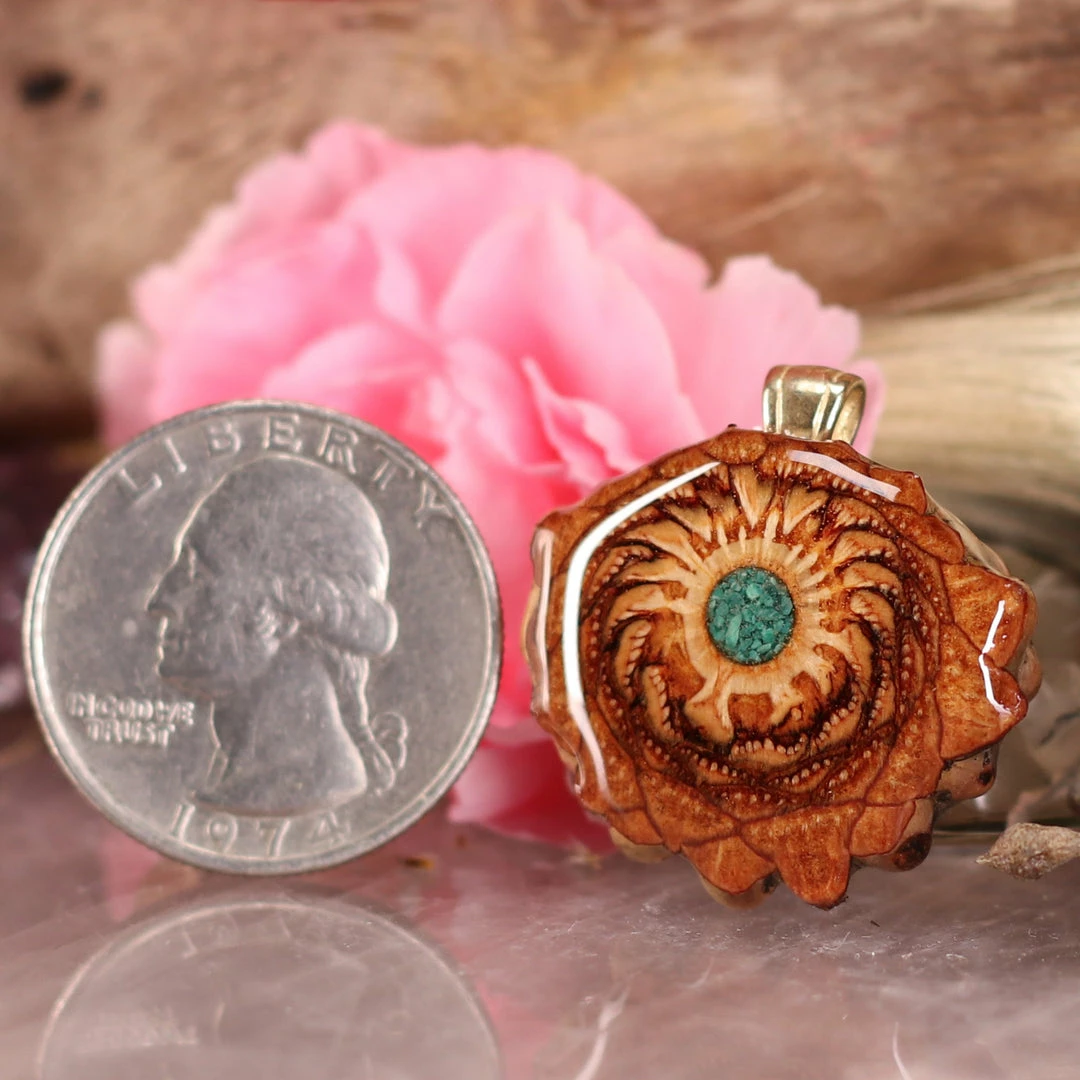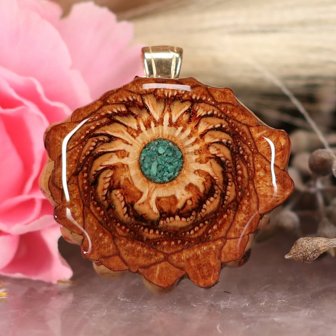 Every pinecone pendant is an elegant gift from Mother Nature — unveiling the ornate Sacred Geometry hidden at the center of one of the world’s densest Pinecones. Because only one cross-section is taken from the “heart” of each Cone, every pendant is absolutely unique, and truly one-of-a-kind.