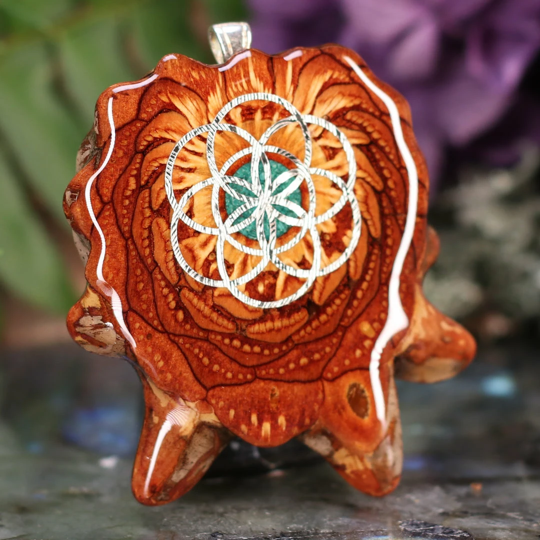 Every pinecone pendant is an elegant gift from Mother Nature — unveiling the ornate Sacred Geometry hidden at the center of one of the world’s densest Pinecones. Because only one cross-section is taken from the “heart” of each Cone, every pendant is absolutely unique, and truly one-of-a-kind.