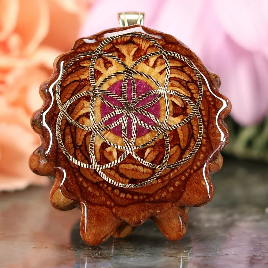 Every pinecone pendant is an elegant gift from Mother Nature — unveiling the ornate Sacred Geometry hidden at the center of one of the world’s densest Pinecones. Because only one cross-section is taken from the “heart” of each Cone, every pendant is absolutely unique, and truly one-of-a-kind.