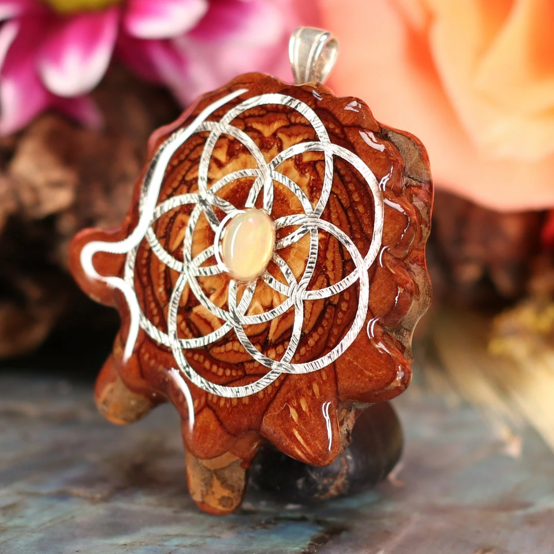 Every pinecone pendant is an elegant gift from Mother Nature — unveiling the ornate Sacred Geometry hidden at the center of one of the world’s densest Pinecones. Because only one cross-section is taken from the “heart” of each Cone, every pendant is absolutely unique, and truly one-of-a-kind.