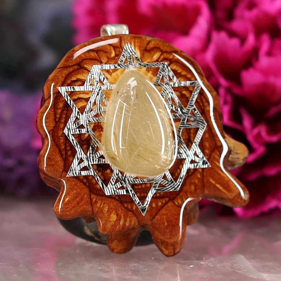 The powerful phosphorescent powder “charges” in natural sunlight (or UV lighting) and backlights the Rutilated Quartz — causing the stone to glow all night long!