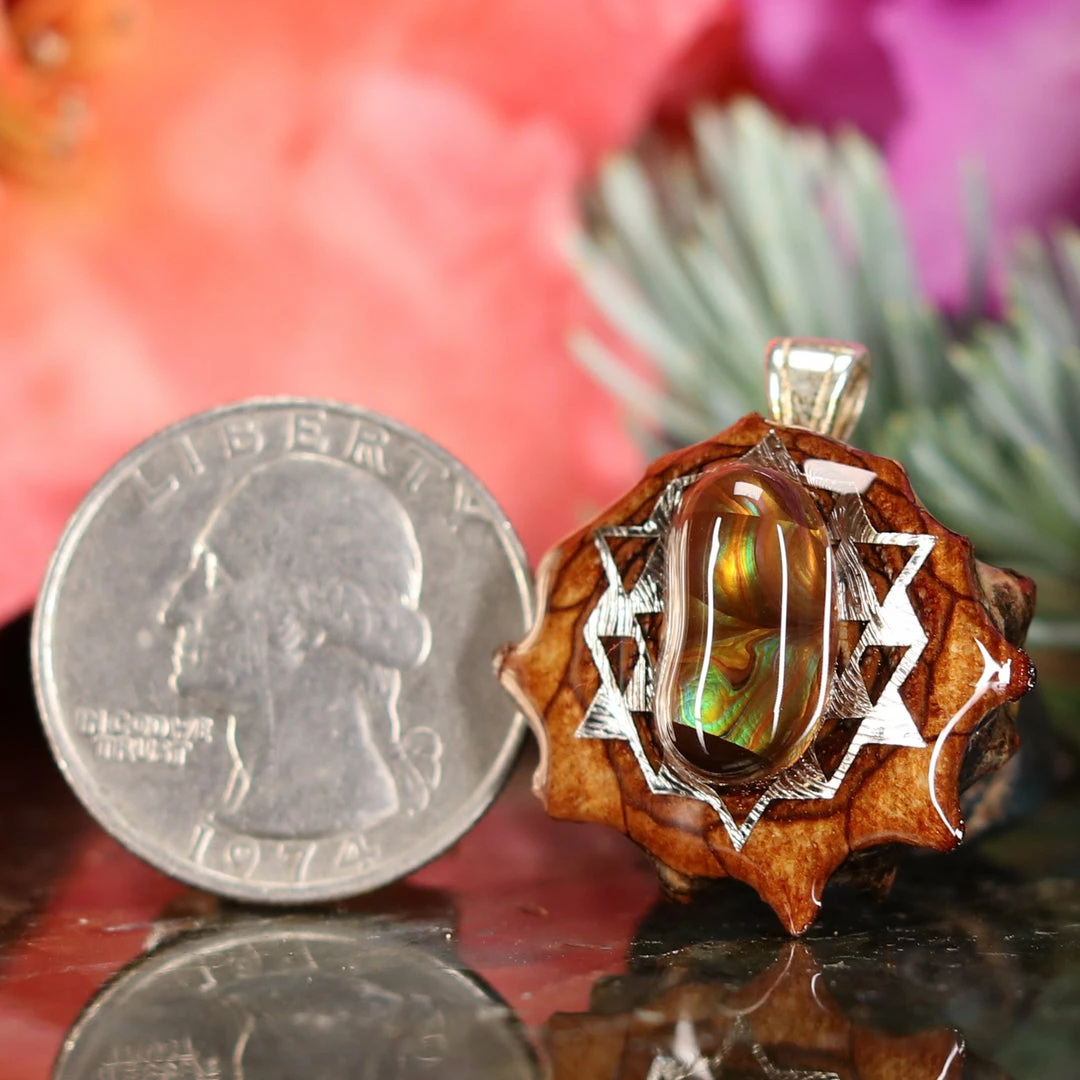 Every pinecone pendant is an elegant gift from Mother Nature — unveiling the ornate Sacred Geometry hidden at the center of one of the world’s densest Pinecones. Because only one cross-section is taken from the “heart” of each Cone, every pendant is absolutely unique, and truly one-of-a-kind.