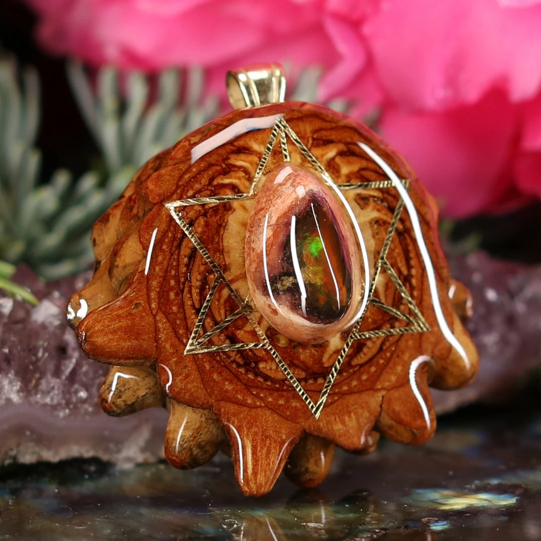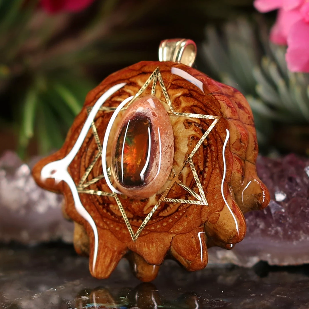 TEP Mexican Fire Opal With Gold Merkaba Pendants