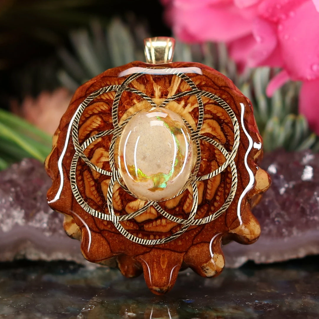 Every pinecone pendant is an elegant gift from Mother Nature — unveiling the ornate Sacred Geometry hidden at the center of one of the world’s densest Pinecones. Because only one cross-section is taken from the “heart” of each Cone, every pendant is absolutely unique, and truly one-of-a-kind.
