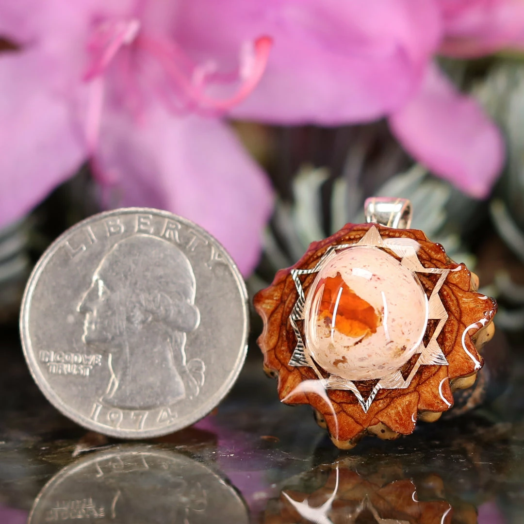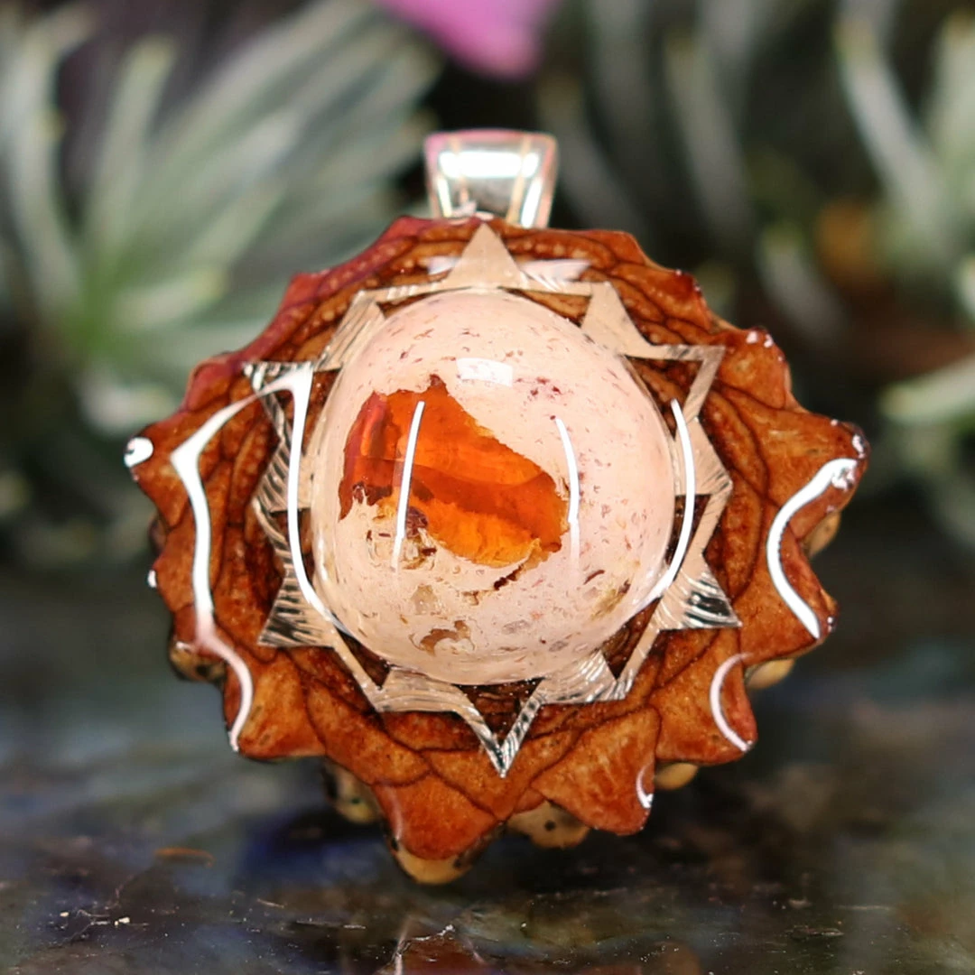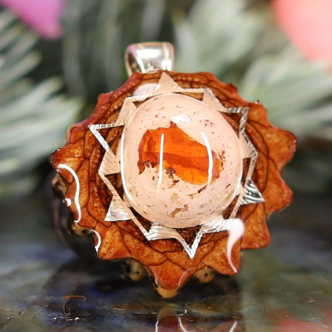 Every pinecone pendant is an elegant gift from Mother Nature — unveiling the ornate Sacred Geometry hidden at the center of one of the world’s densest Pinecones. Because only one cross-section is taken from the “heart” of each Cone, every pendant is absolutely unique, and truly one-of-a-kind.