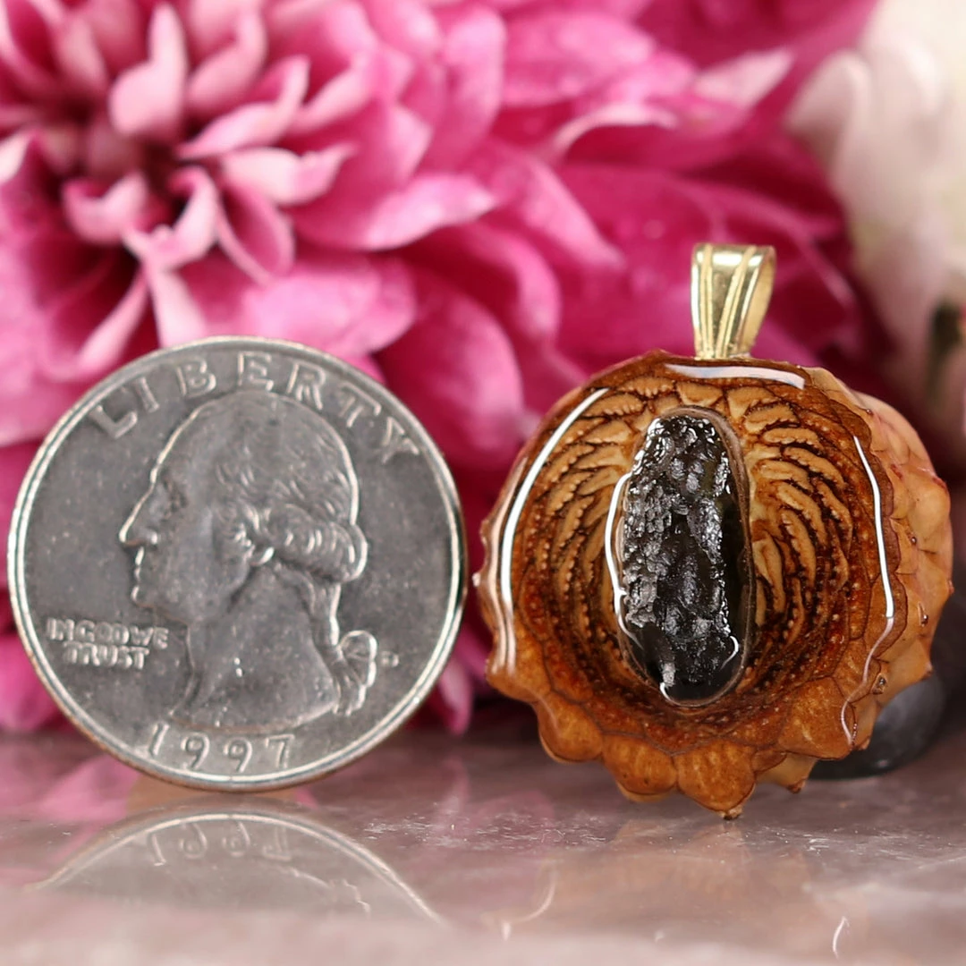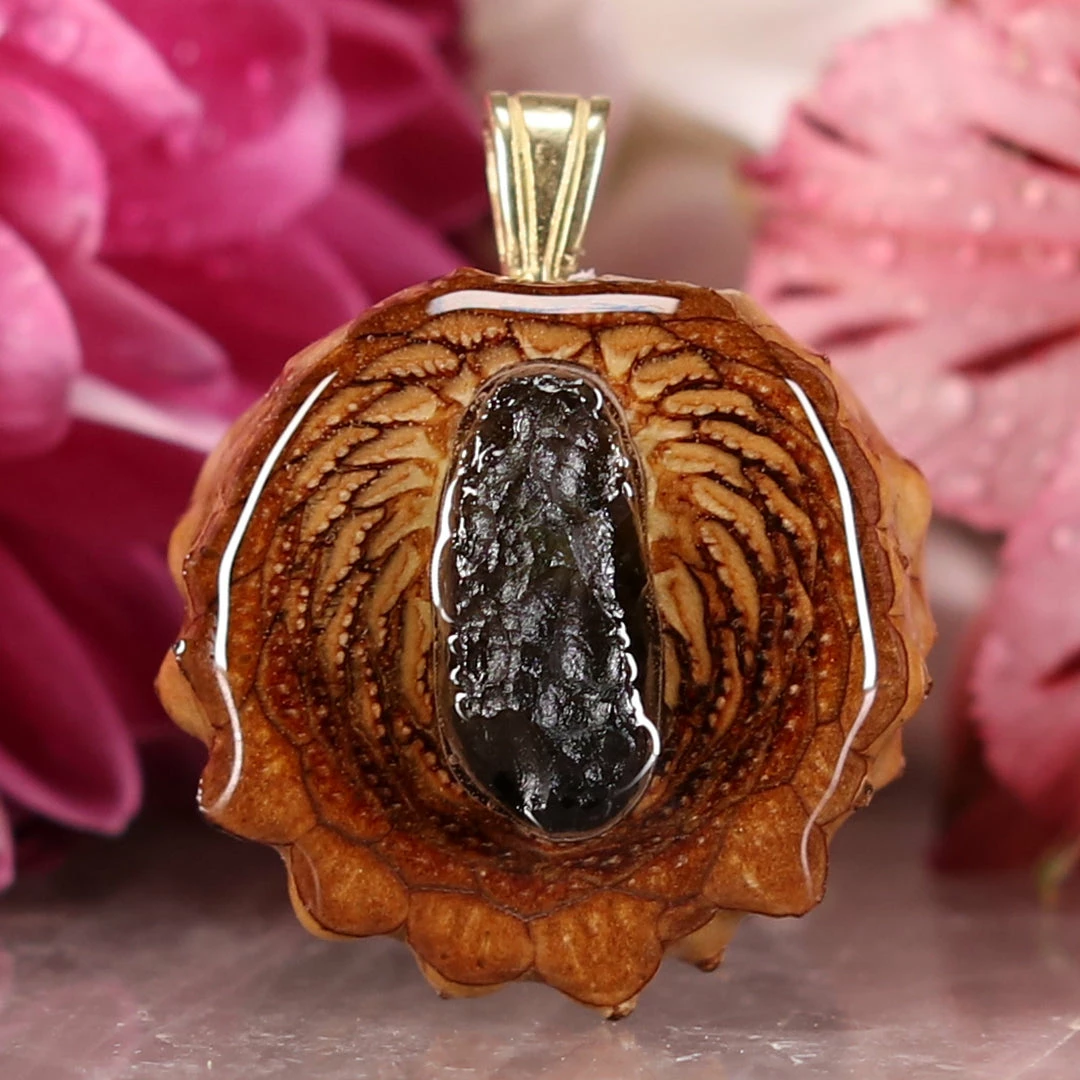 Every pinecone pendant is an elegant gift from Mother Nature — unveiling the ornate Sacred Geometry hidden at the center of one of the world’s densest Pinecones. Because only one cross-section is taken from the “heart” of each Cone, every pendant is absolutely unique, and truly one-of-a-kind.