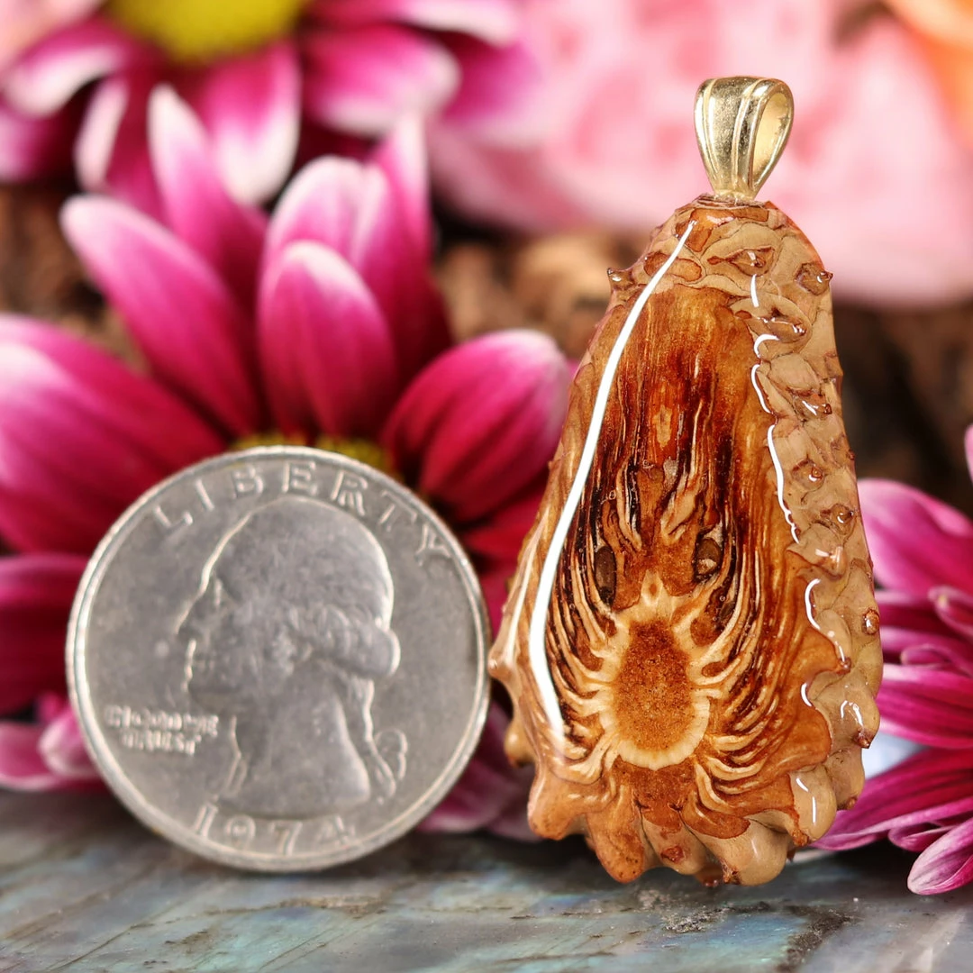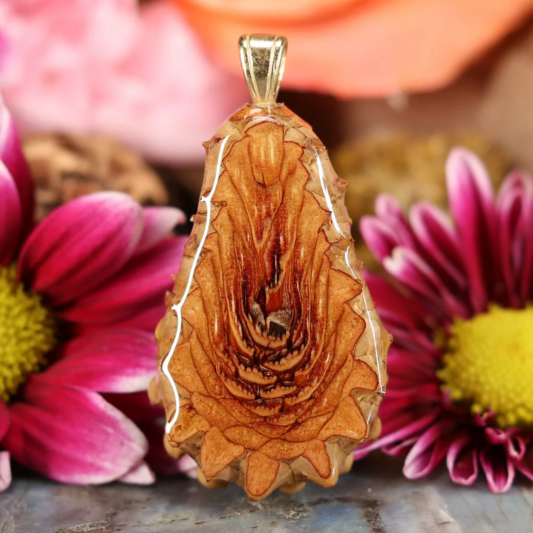 Every pinecone pendant is an elegant gift from Mother Nature — unveiling the ornate Sacred Geometry hidden at the center of one of the world’s densest Pinecones. Because only one cross-section is taken from the “heart” of each Cone, every pendant is absolutely unique, and truly one-of-a-kind.