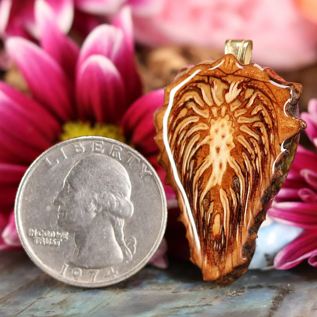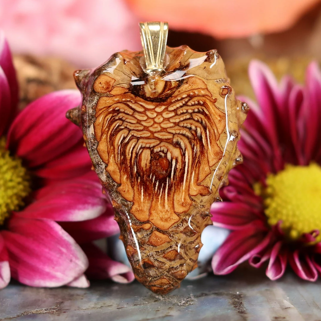 Every pinecone pendant is an elegant gift from Mother Nature — unveiling the ornate Sacred Geometry hidden at the center of one of the world’s densest Pinecones. Because only one cross-section is taken from the “heart” of each Cone, every pendant is absolutely unique, and truly one-of-a-kind.