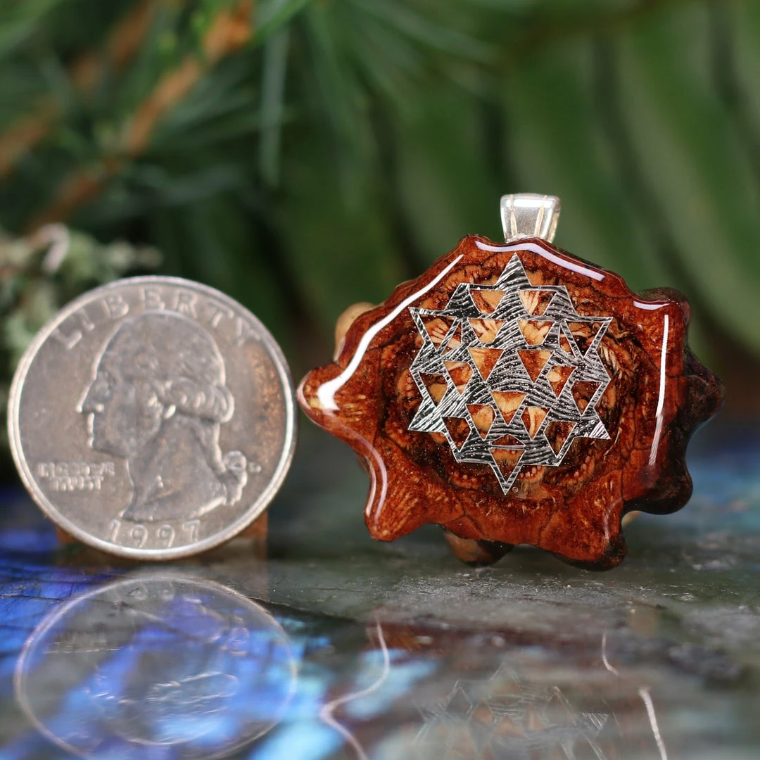 Every “Natural” pendant is an elegant gift from Mother Nature — unveiling the ornate Sacred Geometry hidden at the center of the world’s densest Pinecones. Because only one cross-section is taken from the “heart” of each Cone, every pendant is absolutely unique, and truly the one-of-a-kind.