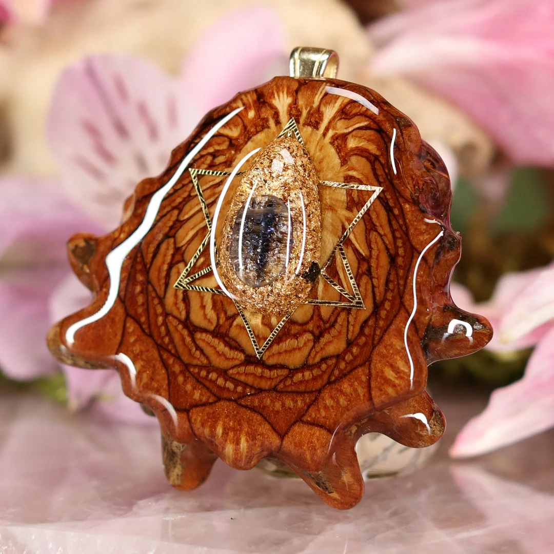 This pendant has been paired with a miniature “Orgone Generator” set with Blue Kyanite to awaken body, mind, and spirit! A magic mix of metal shavings, resin, crystal fragments, and a quartz crystal specially crafted by Third Eye Pinecones help form this uniquely powerful spiritual device. Its benefits are said to be many, primarily because it is believed to draw in harmful ambient EMFs and bio-energy and transmute them within its internal crystalline matrix crystalline matrix – which it then re-emits as positive biomagnetic energy.