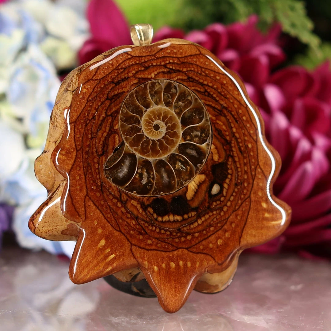 The 240 million year old ammonite fossils form a sacred geometrical shape called the “golden mean spiral,” traveling both infinitely outward and infinitely inward. This spiral can be mathematically represented by the Fibonacci Sequence – the numerical foundation that depicts the underlying growth, movement, and evolution throughout all of nature. Plants unfurl, flowers bloom, and our galaxy spirals according to this sequence. The ammonites are fitted expertly into the center of each pine cone’s mandala so as to blend the golden mean spirals of tree and shell into a single dynamic Fibonacci movement – evoking a sense of wonder and connectedness to our universe’s greater intelligent design.