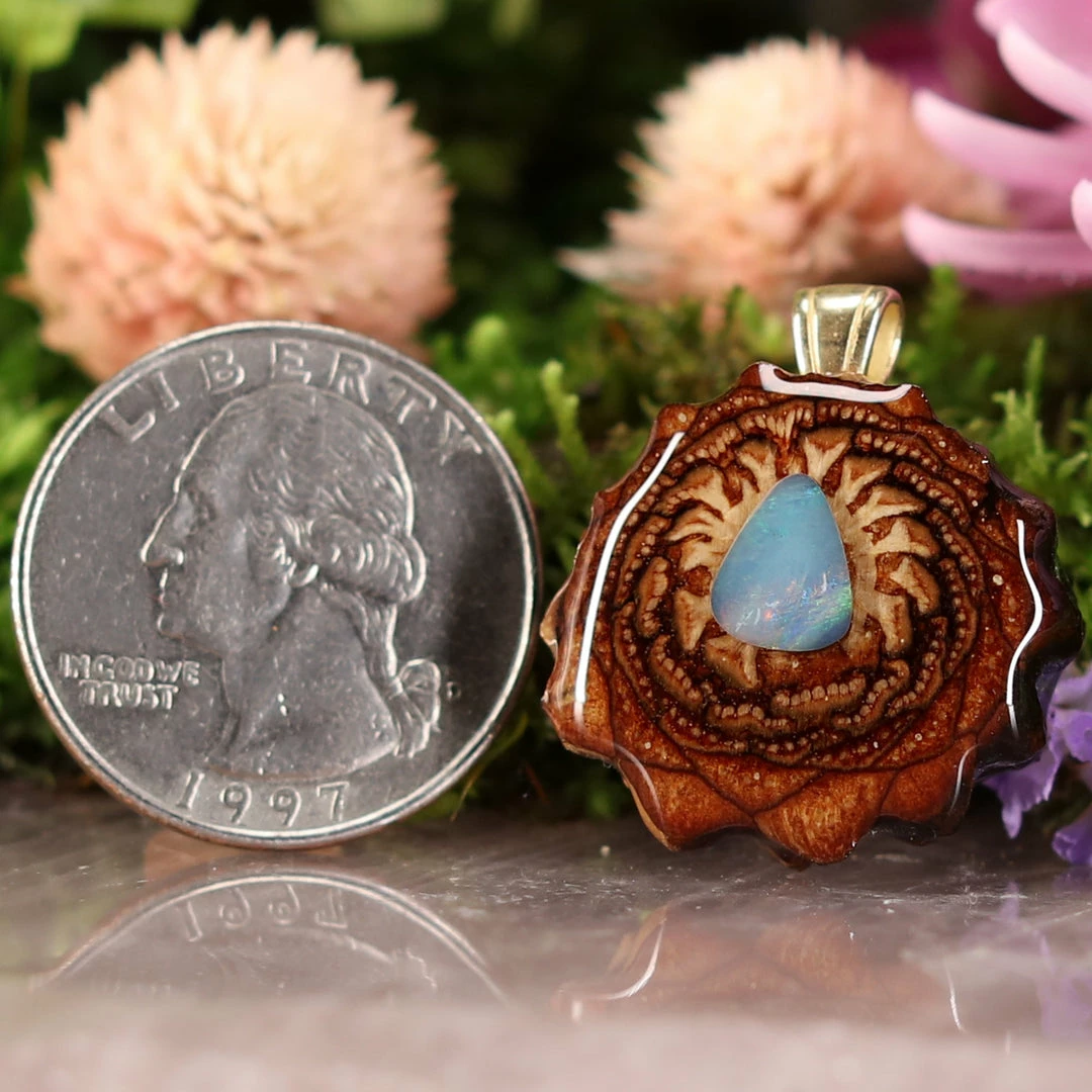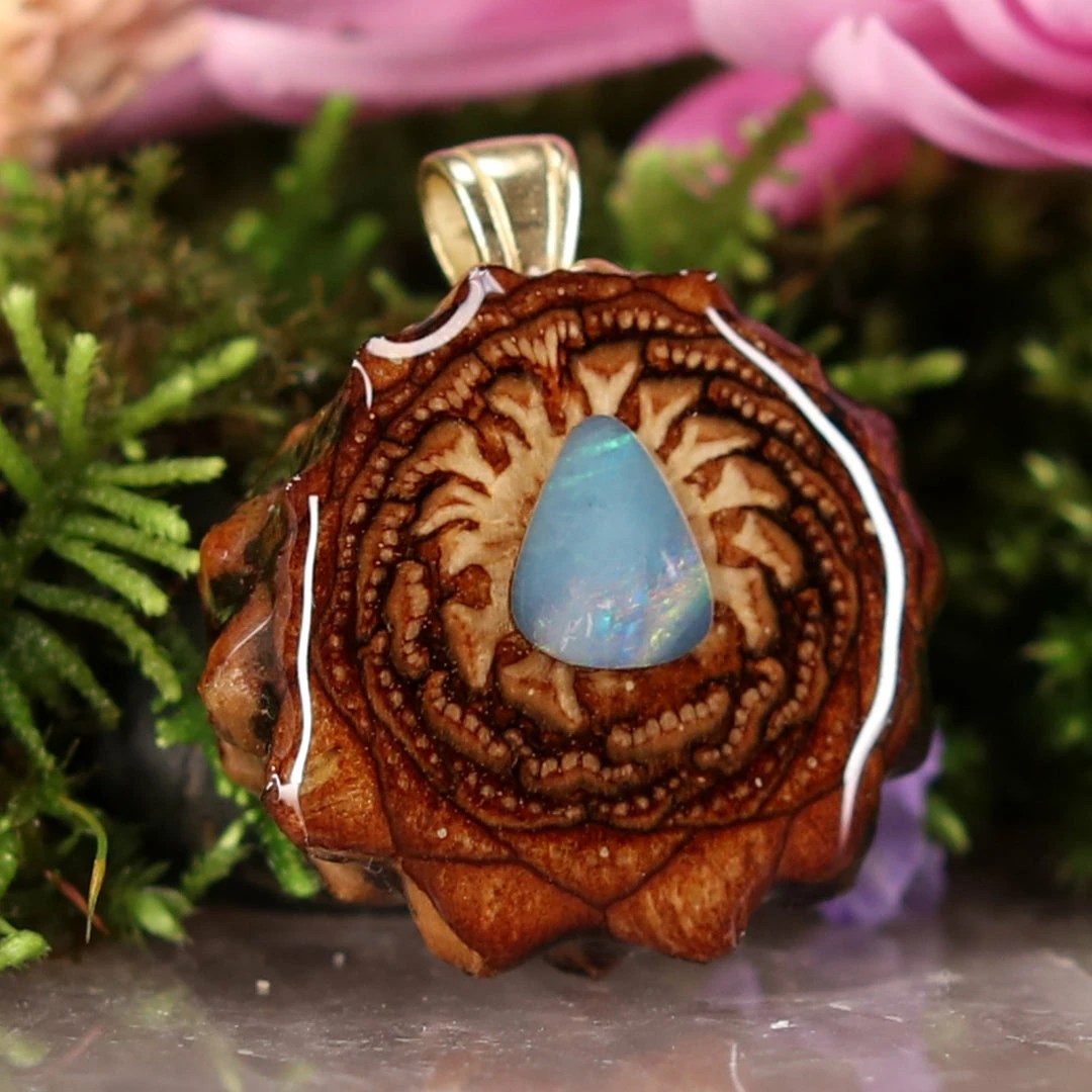 Every pinecone pendant is an elegant gift from Mother Nature — unveiling the ornate Sacred Geometry hidden at the center of one of the world’s densest Pinecones. Because only one cross-section is taken from the “heart” of each Cone, every pendant is absolutely unique, and truly one-of-a-kind.