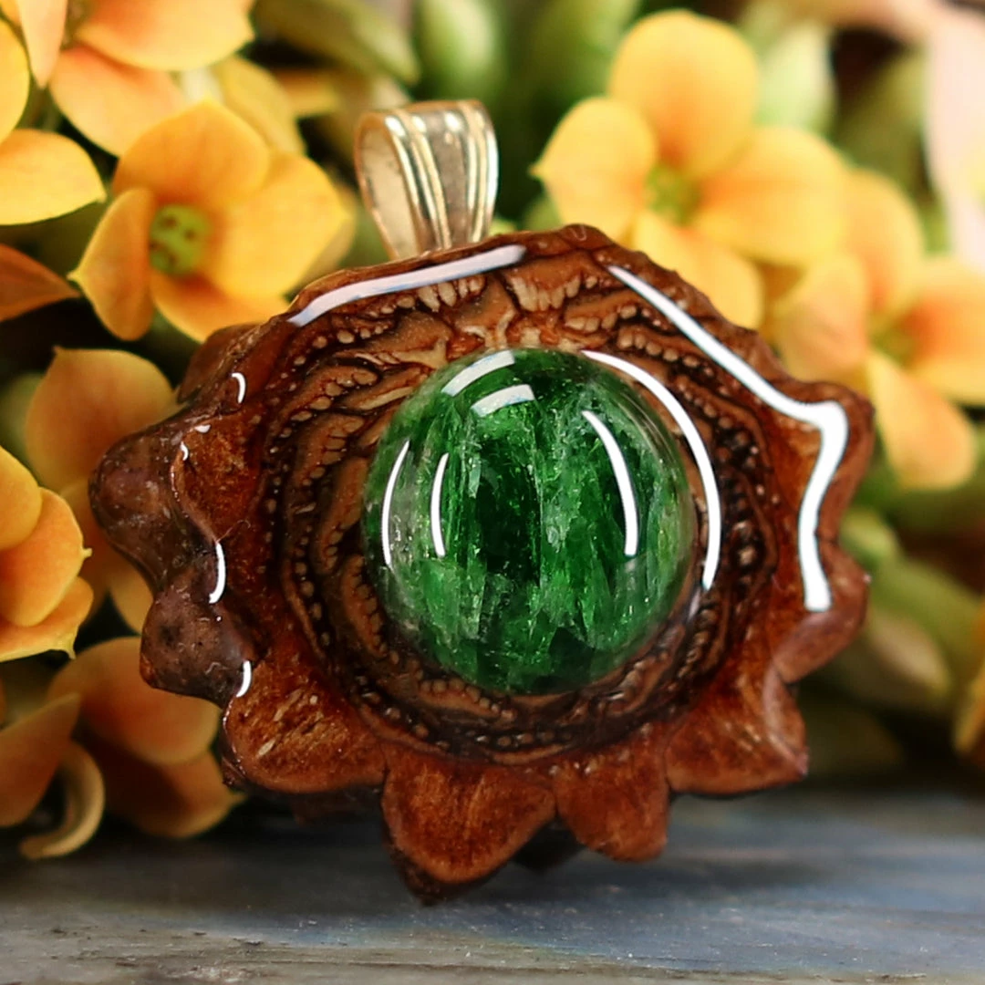 Every pinecone pendant is an elegant gift from Mother Nature — unveiling the ornate Sacred Geometry hidden at the center of one of the world’s densest Pinecones. Because only one cross-section is taken from the “heart” of each Cone, every pendant is absolutely unique, and truly one-of-a-kind.