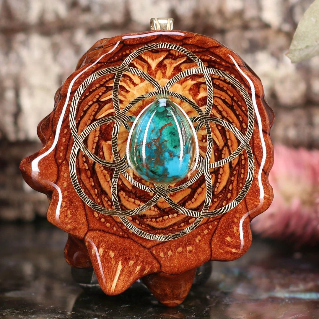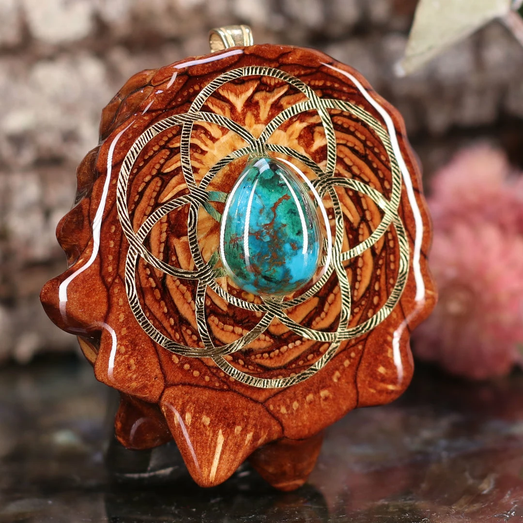 Every pinecone pendant is an elegant gift from Mother Nature — unveiling the ornate Sacred Geometry hidden at the center of one of the world’s densest Pinecones. Because only one cross-section is taken from the “heart” of each Cone, every pendant is absolutely unique, and truly one-of-a-kind.