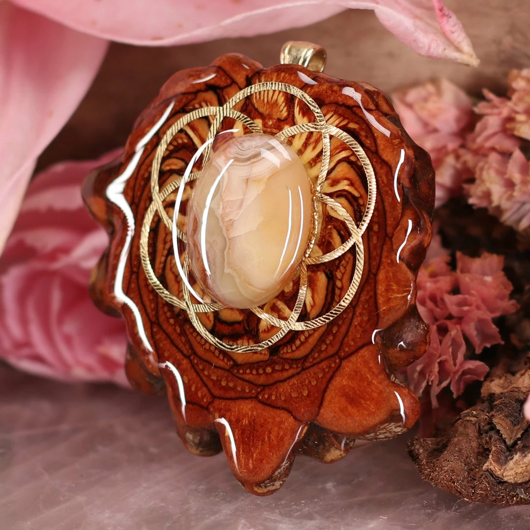 Every pinecone pendant is an elegant gift from Mother Nature — unveiling the ornate Sacred Geometry hidden at the center of one of the world’s densest Pinecones. Because only one cross-section is taken from the “heart” of each Cone, every pendant is absolutely unique, and truly one-of-a-kind.