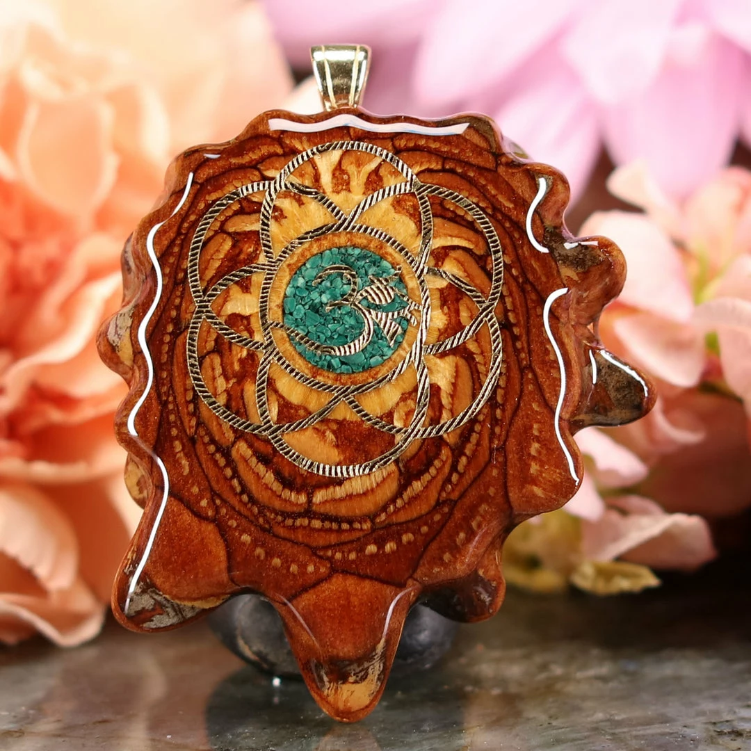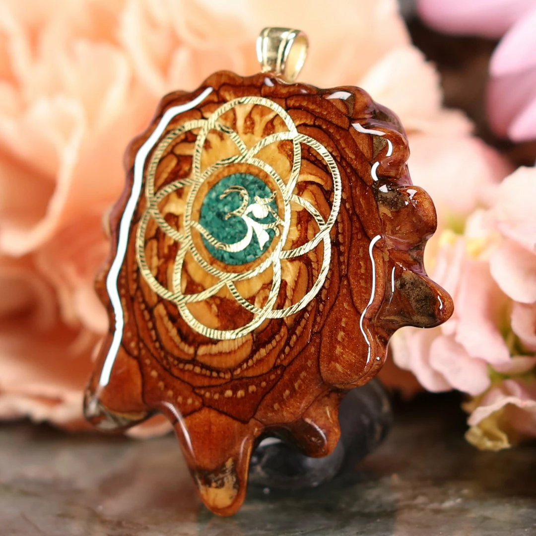 TEP Pendants Crushed Malachite (Glows) With Gold Seed Of Life And Front Om