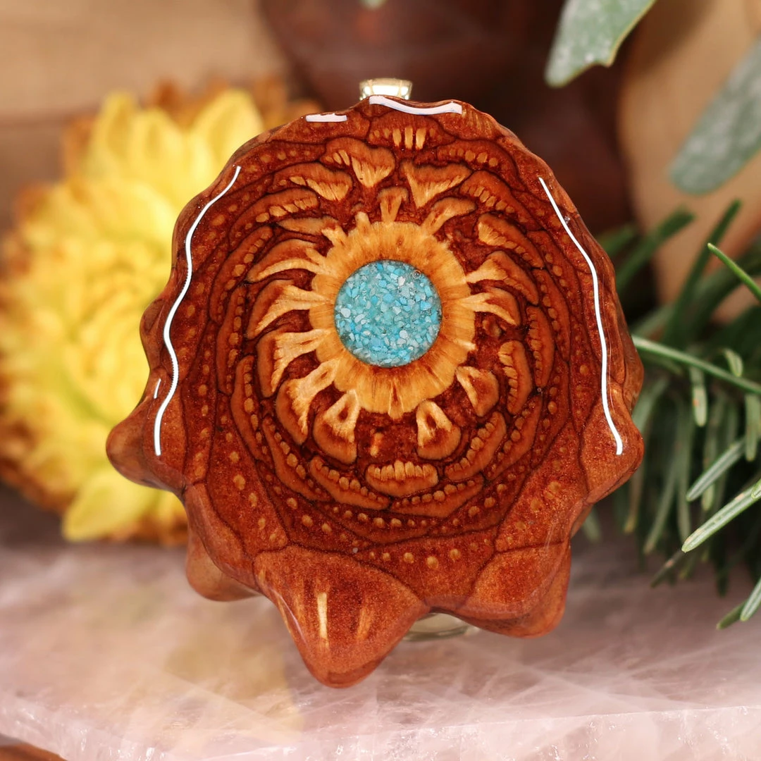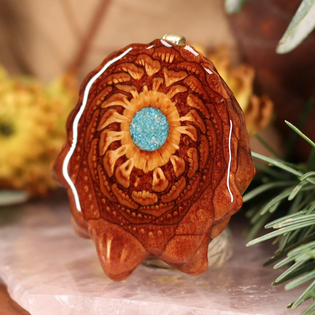 Every pinecone pendant is an elegant gift from Mother Nature — unveiling the ornate Sacred Geometry hidden at the center of one of the world’s densest Pinecones. Because only one cross-section is taken from the “heart” of each Cone, every pendant is absolutely unique, and truly one-of-a-kind.