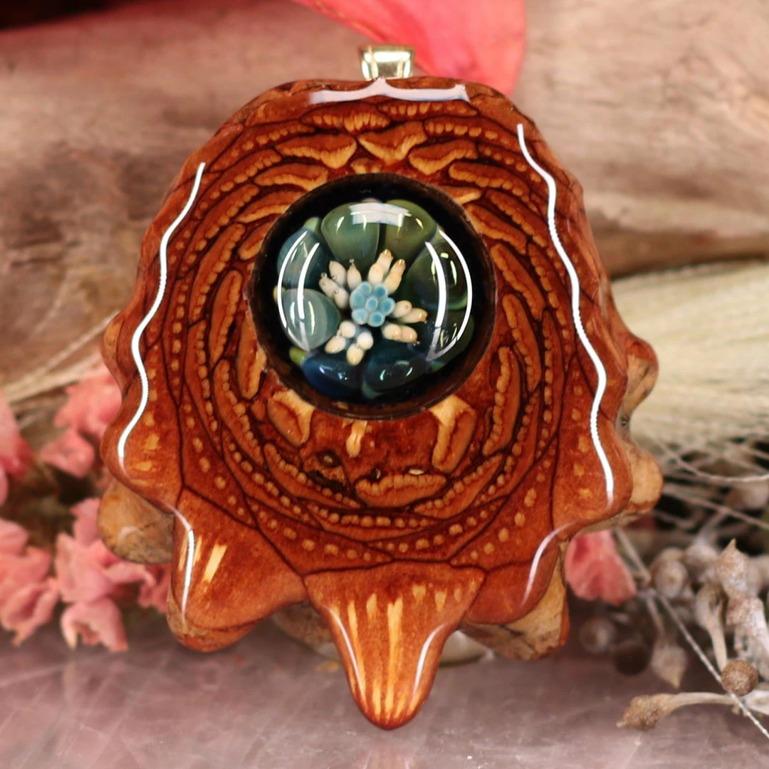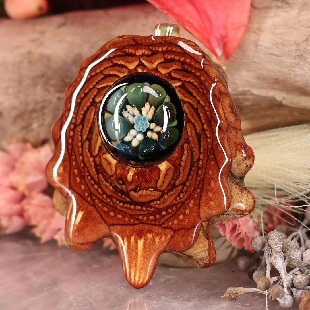 This epic collaboration between Third Eye Pinecones and Nick Anderson Art features a small Glass “Phoenix Orchid” Cab set inside one of our Pinecone Pendants! Each one of these Phoenix Orchid pendants is entirely unique, each with a life of its own. This piece is a one-of-a-kind creation, handmade by Nick, adding an exotic beauty and a stunning natural presence to the person wearing it.