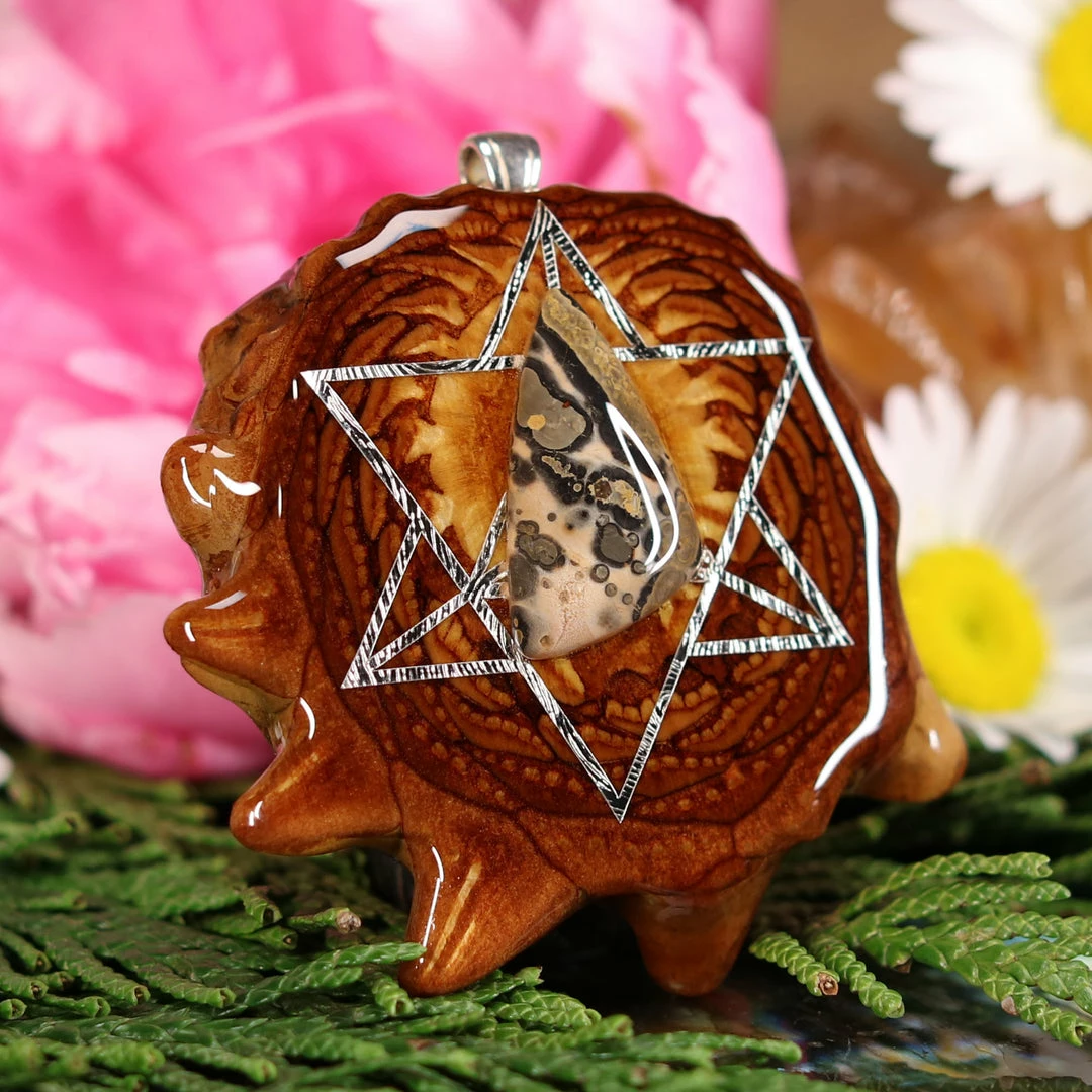 This Pinecone has been anointed with our “Merkaba” emblem, cast in Sterling Silver. Merkaba – “Mer” meaning Light, “Ka” meaning Spirit, and “Ba” meaning Body – is a powerful  icon historically known as the “Vehicle of Ascension”. The Merkaba opens the mind to increased awareness and promotes deep conscious interconnection.