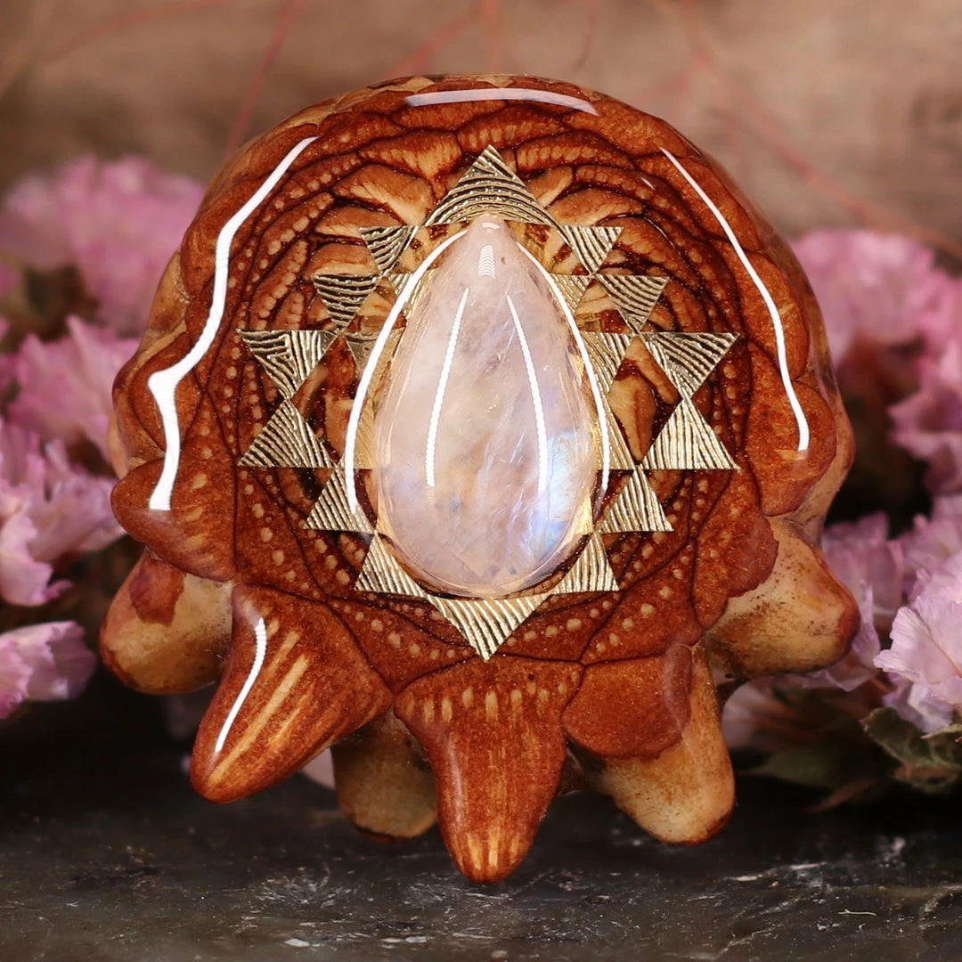 As its name suggests, Moonstone is strongly connected to the archetypal feminine energies of the moon, intuition, and empathy. It allows us to reconnect with the softness of the feminine, facilitating the letting go of stress, fixation, and aggression. Additionally, Moonstone is recognized as a powerful tool to make conscious what is unconscious, bringing ease to practices of mindfulness and higher consciousnesses.