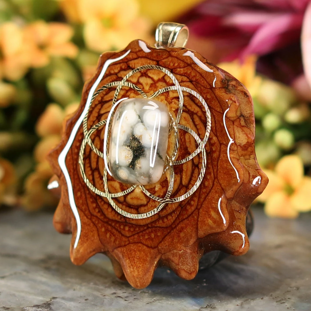 Every pinecone pendant is an elegant gift from Mother Nature — unveiling the ornate Sacred Geometry hidden at the center of one of the world’s densest Pinecones. Because only one cross-section is taken from the “heart” of each Cone, every pendant is absolutely unique, and truly one-of-a-kind.