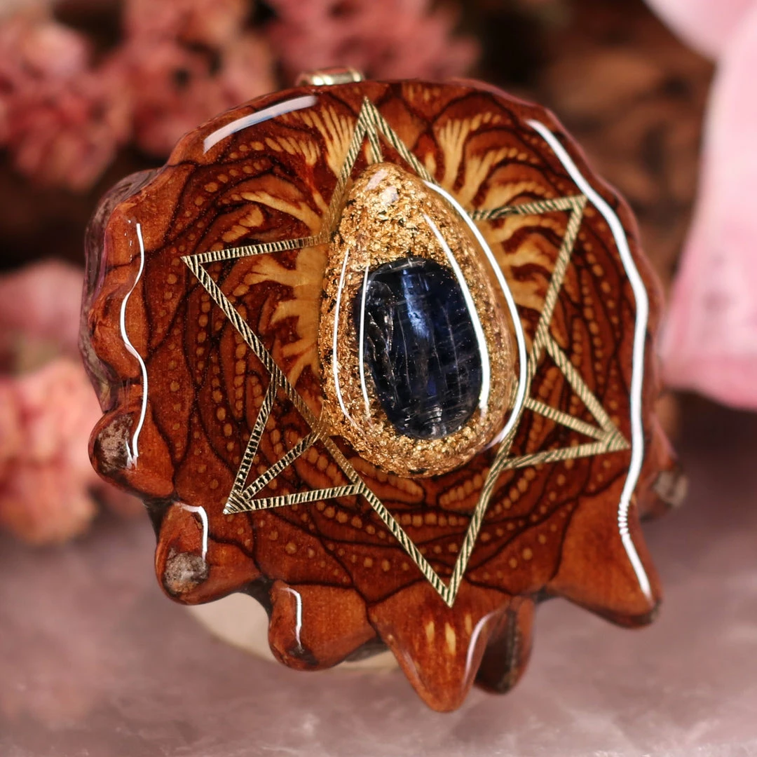 This pendant has been paired with a miniature “Orgone Generator” set with Blue Kyanite to awaken body, mind, and spirit! A magic mix of metal shavings, resin, crystal fragments, and a quartz crystal specially crafted by Third Eye Pinecones help form this uniquely powerful spiritual device. Its benefits are said to be many, primarily because it is believed to draw in harmful ambient EMFs and bio-energy and transmute them within its internal crystalline matrix crystalline matrix – which it then re-emits as positive biomagnetic energy.