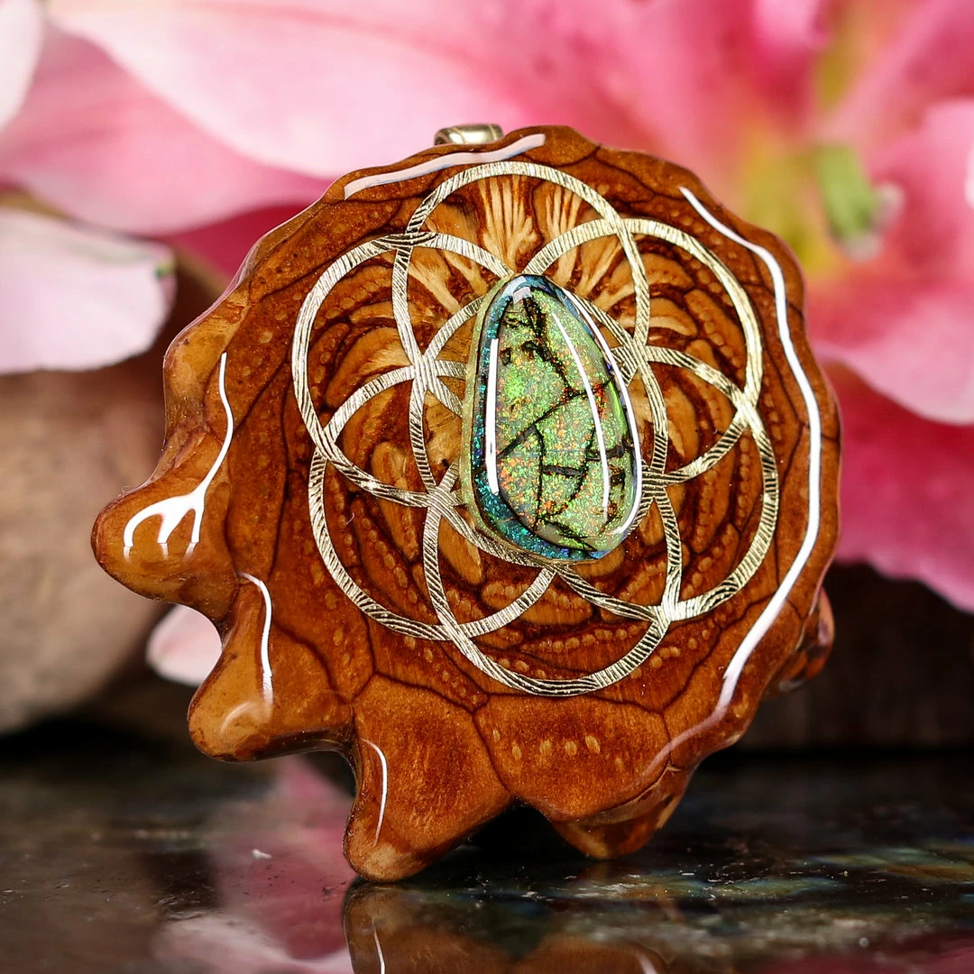 Every pinecone pendant is an elegant gift from Mother Nature — unveiling the ornate Sacred Geometry hidden at the center of one of the world’s densest Pinecones. Because only one cross-section is taken from the “heart” of each Cone, every pendant is absolutely unique, and truly one-of-a-kind.