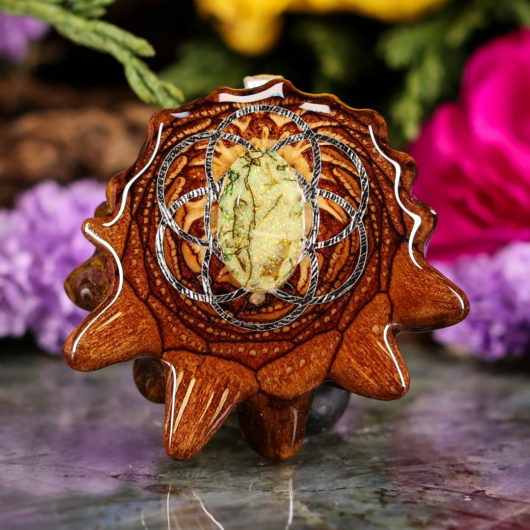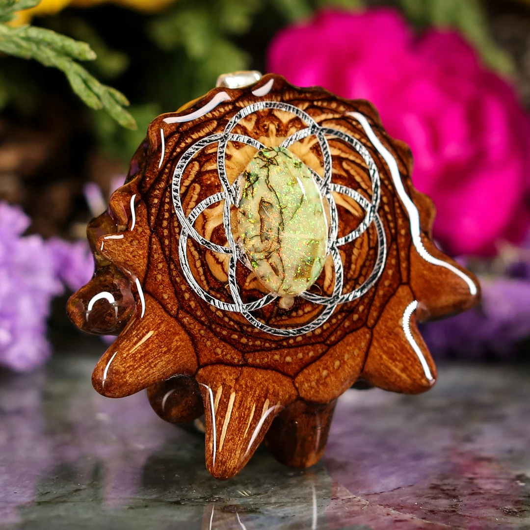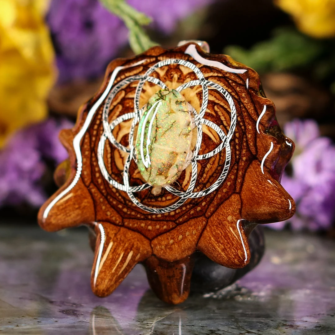 Every pinecone pendant is an elegant gift from Mother Nature — unveiling the ornate Sacred Geometry hidden at the center of one of the world’s densest Pinecones. Because only one cross-section is taken from the “heart” of each Cone, every pendant is absolutely unique, and truly one-of-a-kind.