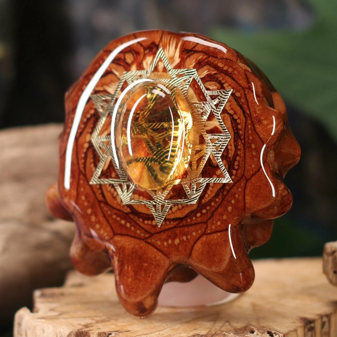 This Pinecone has been imprinted with the 64 Star Tetrahedron, cast in 24k gold. Envisioned as a 3-dimensional model of the I Ching, an ancient set of oracular Chinese Hexagrams, this emblem symbolizes the Creator, or the Great Void – the fundamental pattern that creates all matter.