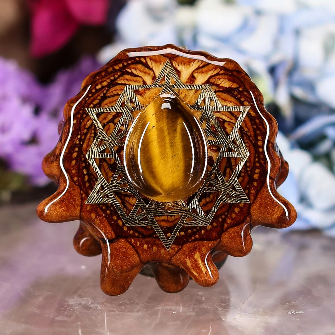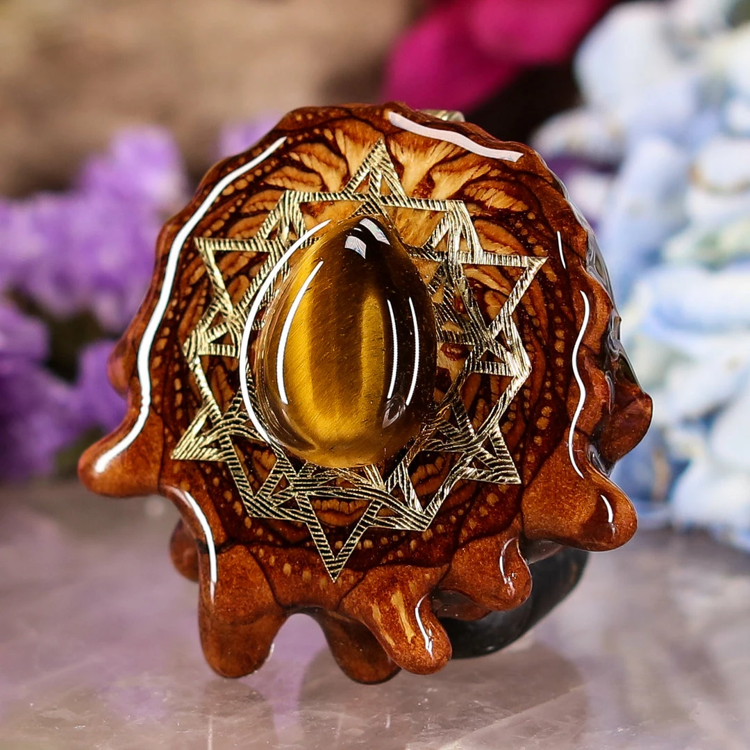 This Pinecone has been imprinted with the 64 Star Tetrahedron, cast in 24k Gold. Envisioned as a 3-dimensional model of the I Ching, an ancient set of oracular Chinese Hexagrams, this emblem symbolizes the Creator, or the Great Void – the fundamental pattern that creates all matter.