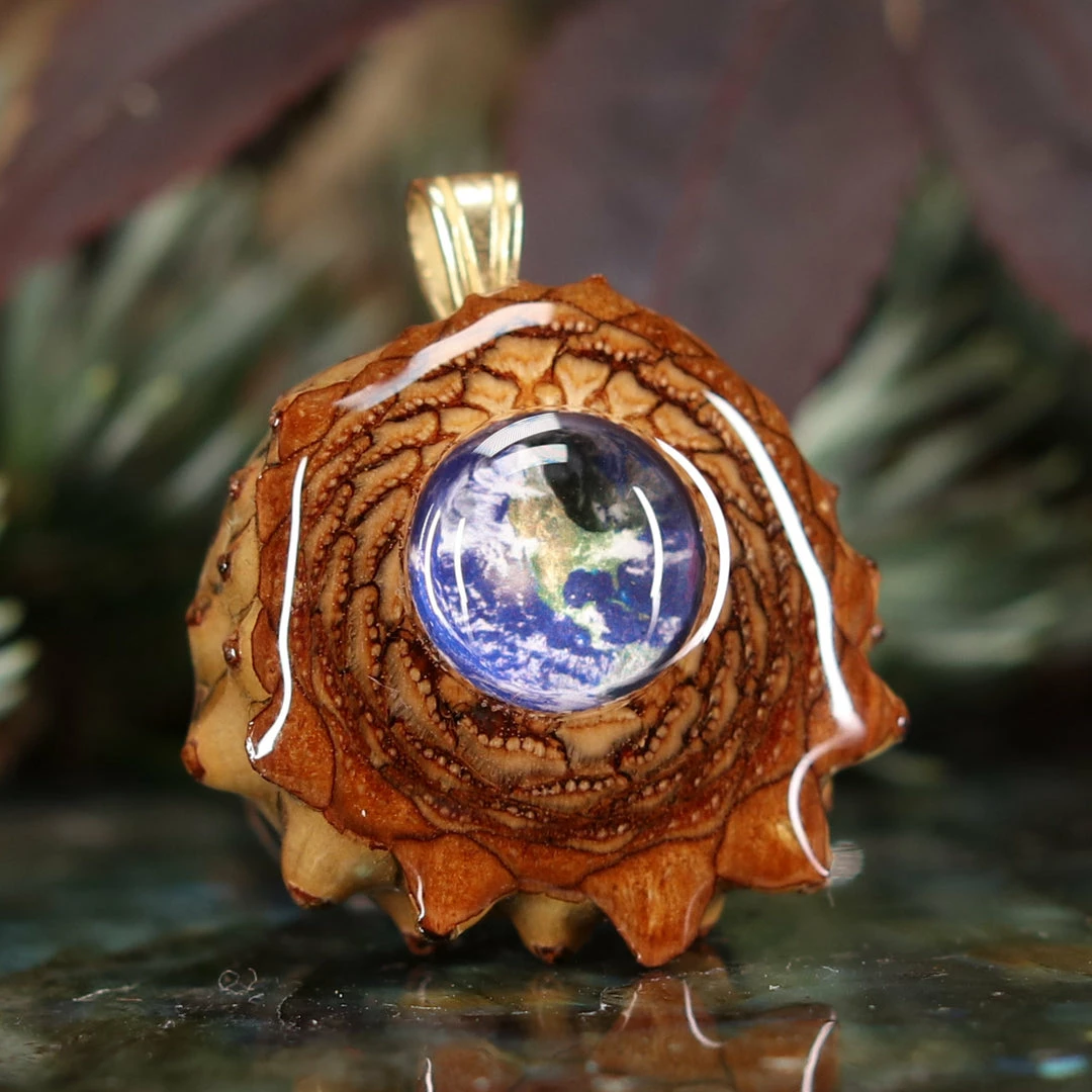 Every pinecone pendant is an elegant gift from Mother Nature — unveiling the ornate Sacred Geometry hidden at the center of one of the world’s densest Pinecones. Because only one cross-section is taken from the “heart” of each Cone, every pendant is absolutely unique, and truly one-of-a-kind.