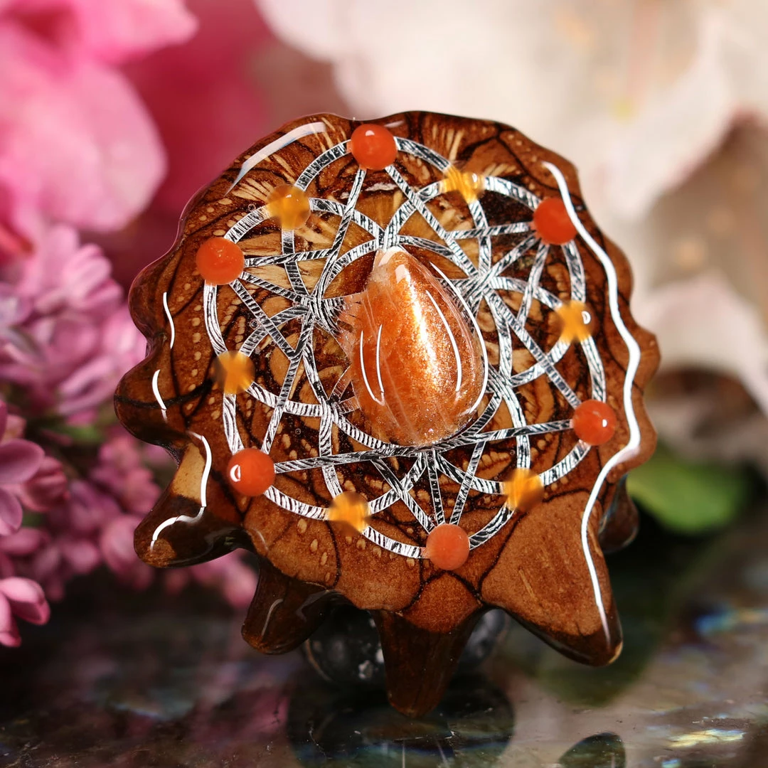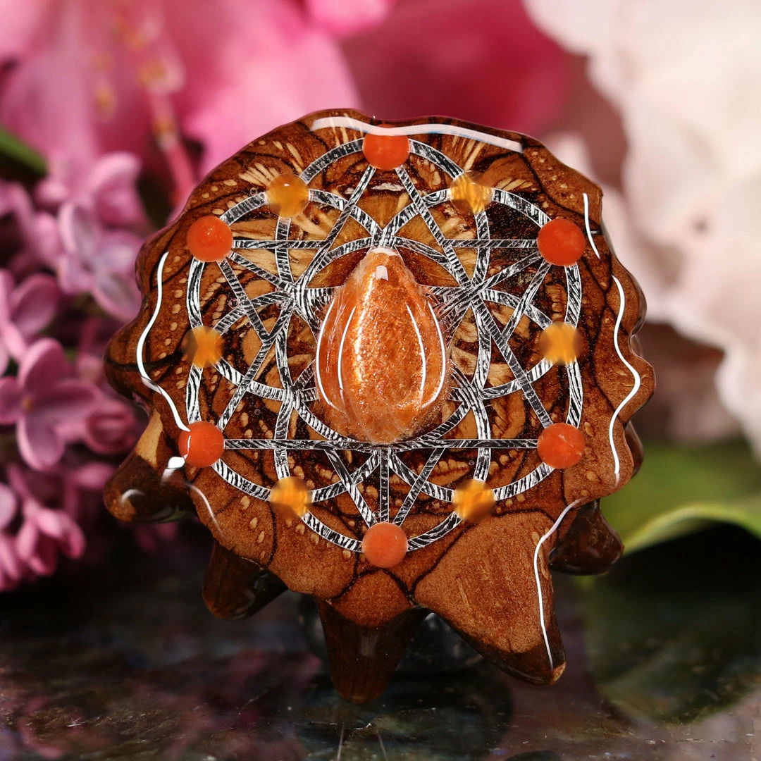 This Pinecone has been anointed with our “Merkaba” emblem, cast in Sterling Silver. Merkaba – “Mer” meaning Light, “Ka” meaning Spirit, and “Ba” meaning Body – is a powerful  icon historically known as the “Vehicle of Ascension”. The Merkaba opens the mind to increased awareness and promotes deep conscious interconnection.