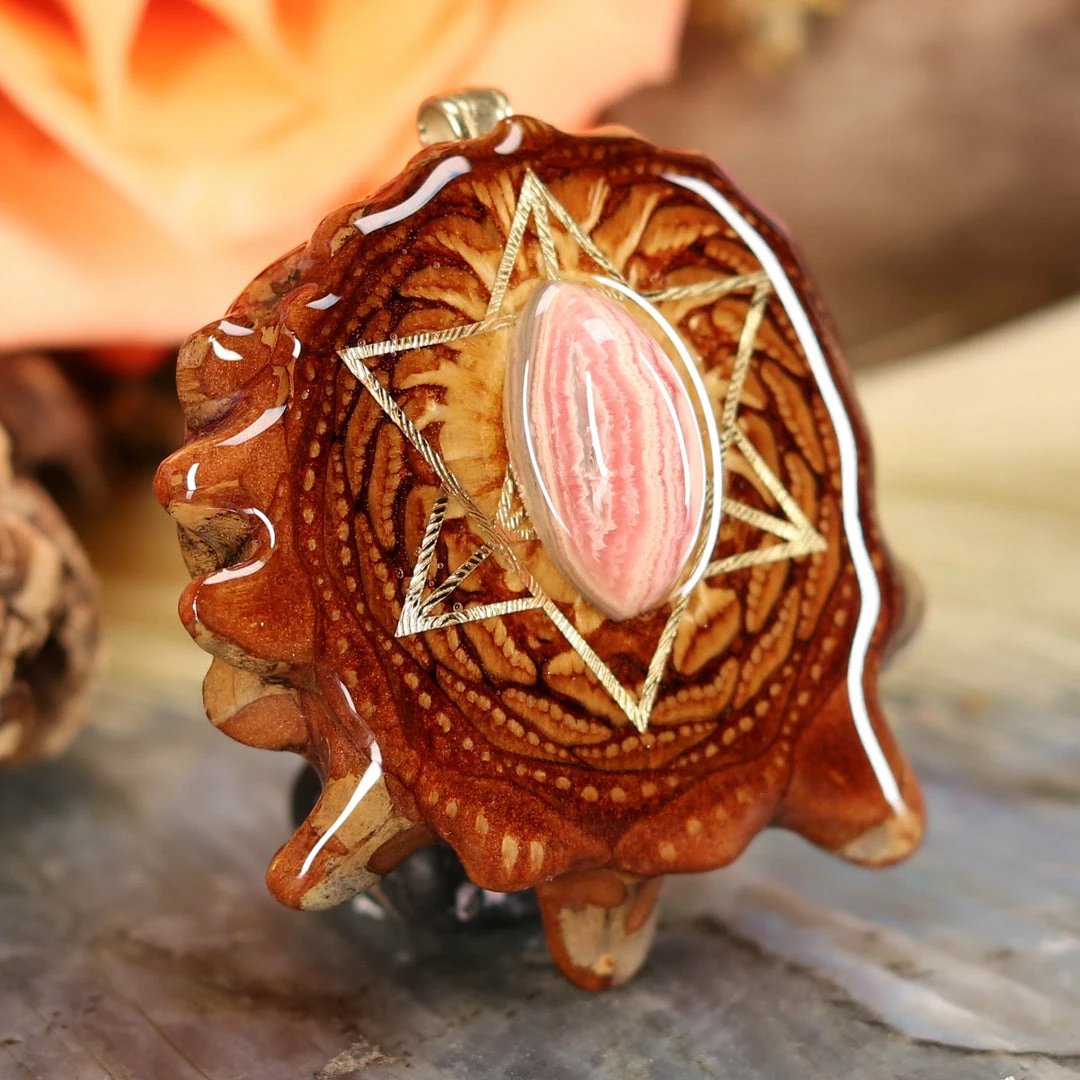 Every pinecone pendant is an elegant gift from Mother Nature — unveiling the ornate Sacred Geometry hidden at the center of one of the world’s densest Pinecones. Because only one cross-section is taken from the “heart” of each Cone, every pendant is absolutely unique, and truly one-of-a-kind.