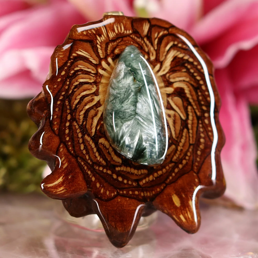 Every pinecone pendant is an elegant gift from Mother Nature — unveiling the ornate Sacred Geometry hidden at the center of one of the world’s densest Pinecones. Because only one cross-section is taken from the “heart” of each Cone, every pendant is absolutely unique, and truly one-of-a-kind.