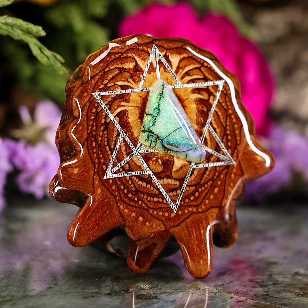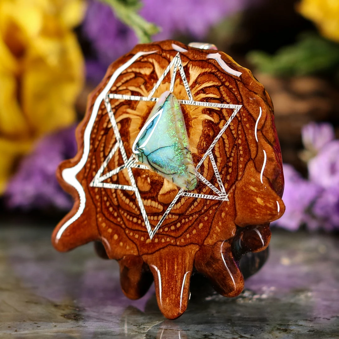This Pinecone has been anointed with our “Merkaba” emblem, cast in Sterling Silver. Merkaba – “Mer” meaning Light, “Ka” meaning Spirit, and “Ba” meaning Body – is a powerful icon historically known as the “Vehicle of ascension”. The Merkaba opens the mind to increased awareness and promotes deep conscious interconnection.