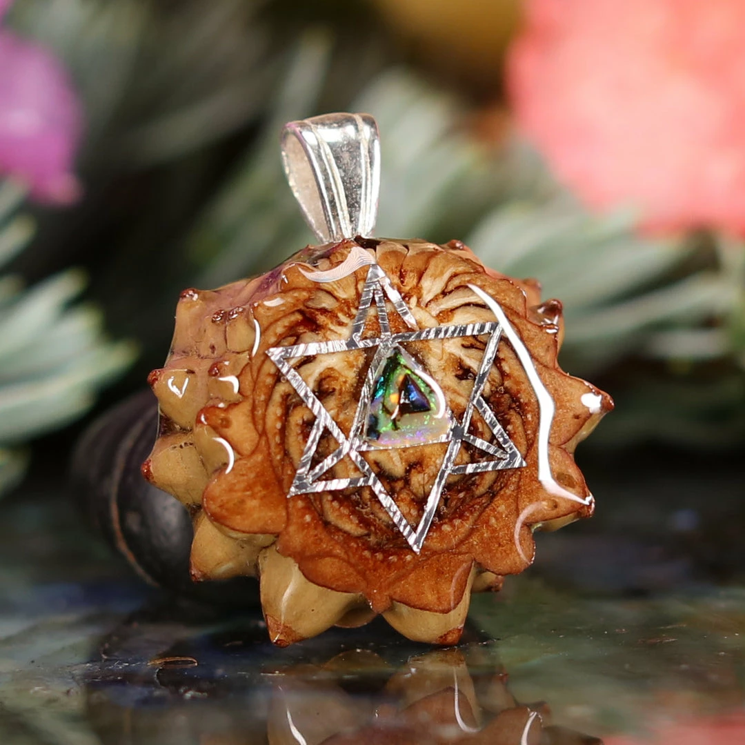 This Pinecone has been anointed with our “Merkaba” emblem, cast in Sterling Silver. Merkaba – “Mer” meaning Light, “Ka” meaning Spirit, and “Ba” meaning Body – is a powerful icon historically known as the “Vehicle of ascension”. The Merkaba opens the mind to increased awareness and promotes deep conscious interconnection.