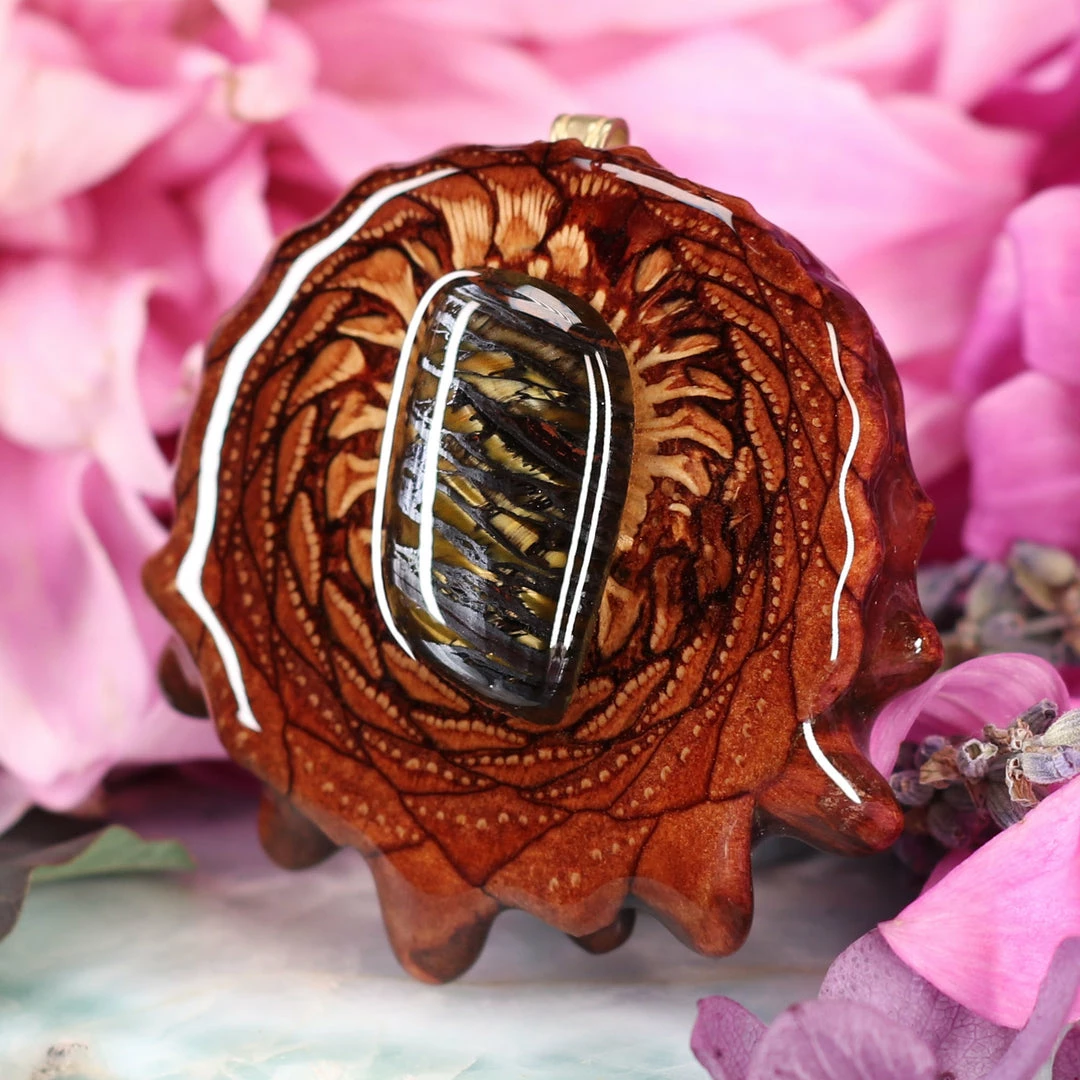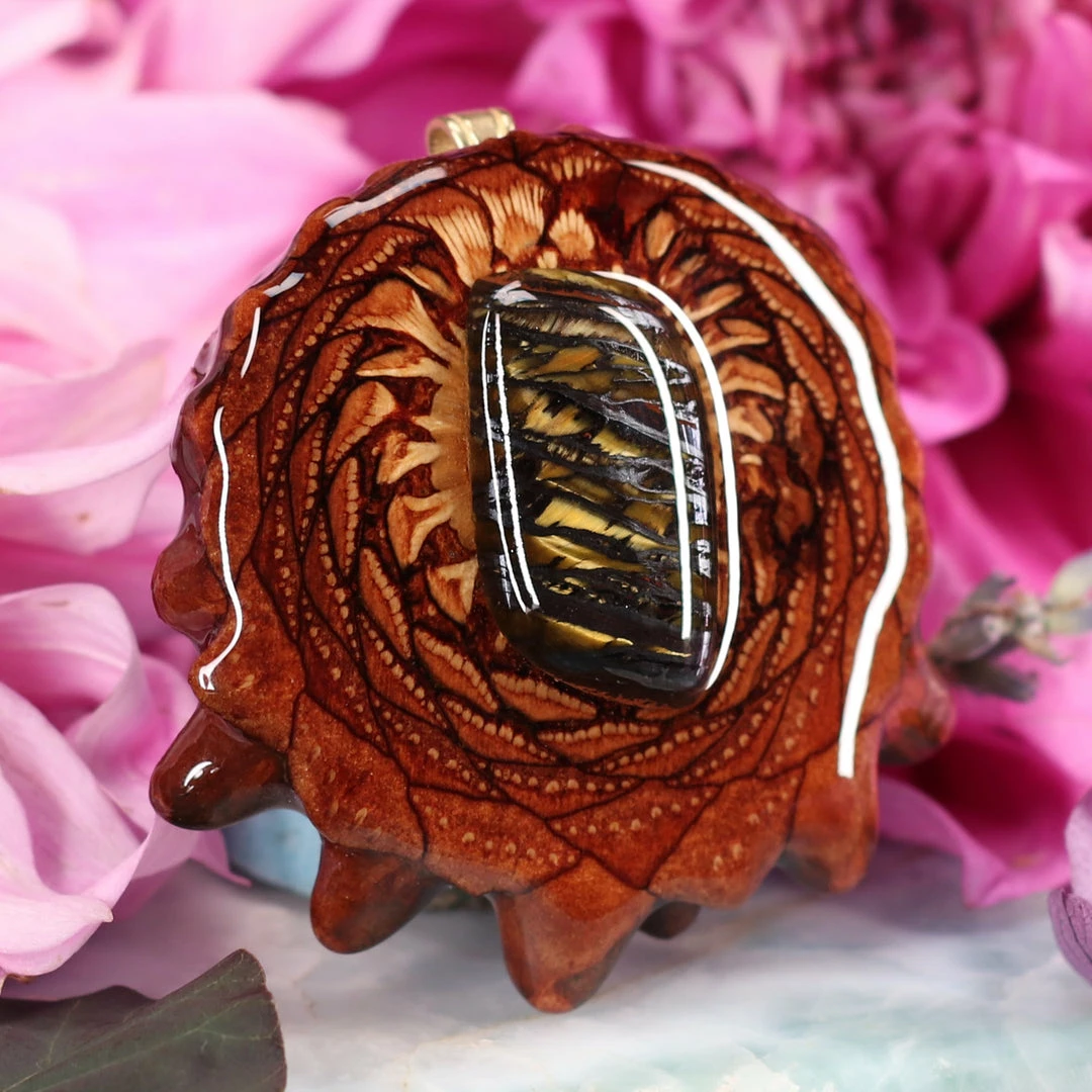 Every pinecone pendant is an elegant gift from Mother Nature — unveiling the ornate Sacred Geometry hidden at the center of one of the world’s densest Pinecones. Because only one cross-section is taken from the “heart” of each Cone, every pendant is absolutely unique, and truly one-of-a-kind.
